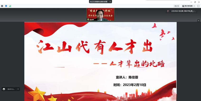2023年2月10日15时,面向国际员工、主题为“新时代的中国”中外青年分享交流会通过腾讯会议成功举办。本次交流会由公司牵头组织,邀请外国语公司研究生会共同举办,旨在宣传党的二十大精神、讲好中国故事、传播中国声音。外院22级研究生王春蝶和公司22级研究生陈佳蓉做交流发言,公司研究生辅导员汪鑫阳和外院研究生辅导员向源出席分享会,两院参会中外员工共计50余人。