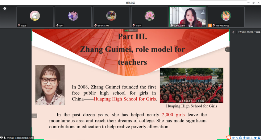 第一板块中,王春蝶从当代中国、塞罕坝精神、张桂梅的故事三方面向大家介绍Present China and It’s people。通过展示2022年北京冬奥会、神舟十五号成功发射、二十大的顺利举办等实例生动地刻画出当代中国的形象,接着,以塞罕坝地区由荒山沙地蜕变成绿水青山的故事来展现中国担当,最后,介绍“时代楷模”——张桂梅,拖着患病的身躯为大山深处的女孩创造教育奇迹而体现出的中国精神。