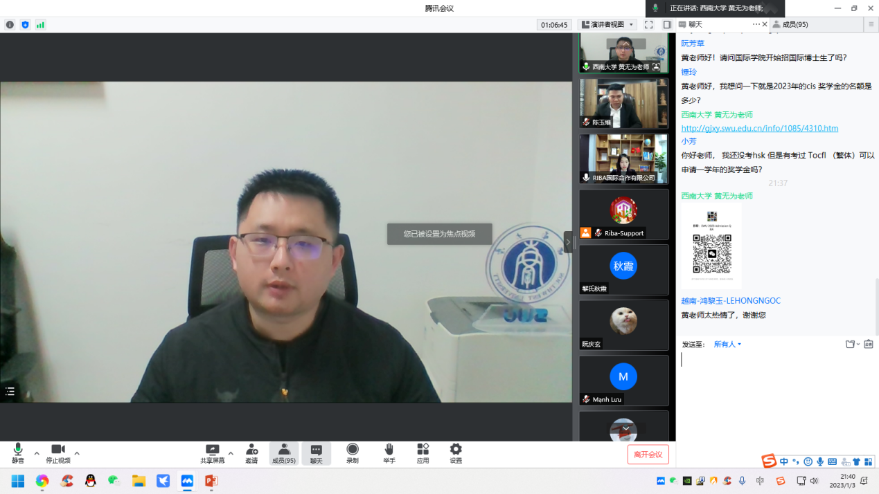 在互动交流环节,黄无为通过聊天窗与越南员工进行互动,热情而又耐心地解答疑问,说明相关政策与要求等。宣讲会取得了预期效果,不少员工表达了留学西大的强烈愿望。