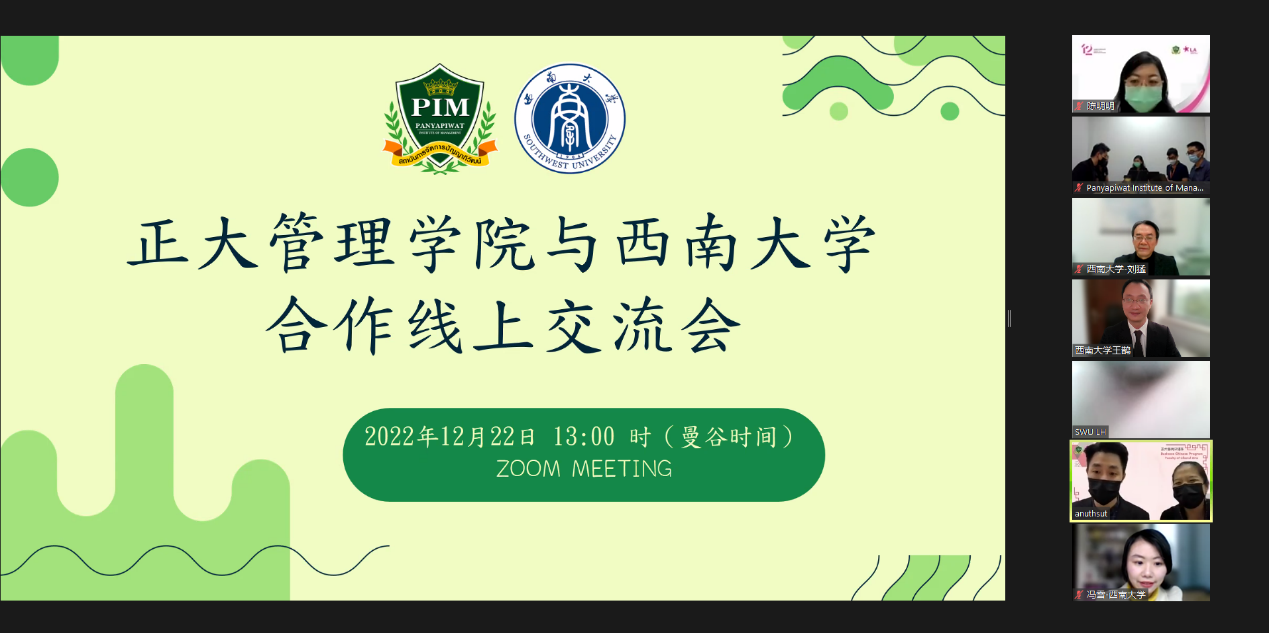 2022年12月22日下午,公司与泰国正大管理公司(以下简称PIM)成功举办线上校际合作项目推进会。正大管理公司文公司副经理陈明明,公司bevictor1946韦德官网刘猛书记、李航副经理出席会议。