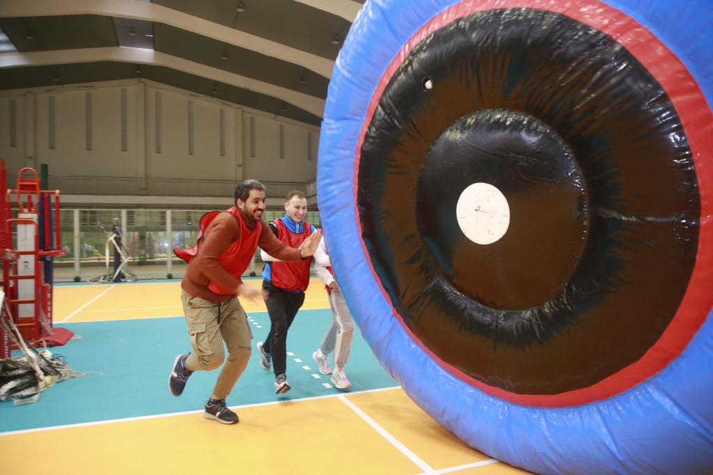 第二个项目为龟兔赛跑。各队分为四个小组,每组五人,每人分别进入乌龟道具的各个洞内,需大家一起抬起“乌龟”向前跑,完成接力。这是一个需要合理分配队内成员体力的项目,更是一个需要全力加速冲刺的大比拼。赛场上,大家脚挨着脚,脑袋和肩膀左右不停晃动。“一二、一二”,红队喊着整齐的口号,奋力冲向终点,迎来了队友们热烈的欢呼声与掌声。