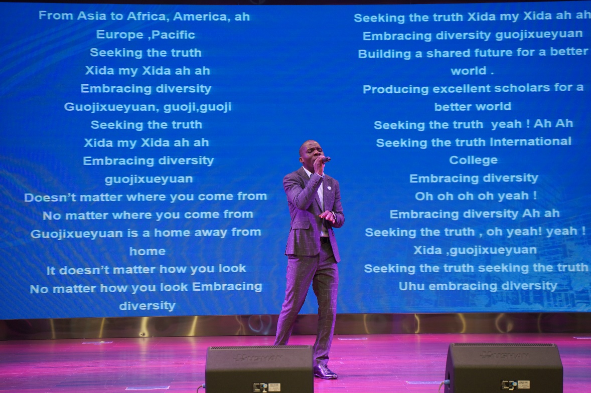 活动现场展示了公司中外师生代表书写院训的书法作品。他们用笔墨挥洒对于公司的热爱,用字里行间的线条与架构表达“真知”与“大同”的深刻内涵。泰国孔敬大学孔子公司中方经理耿军,采用视频的形式展示自己“求真知 谋大同”的书法作品,倡导莘莘学子孜孜追求真知、掌握人类命运共同体应有之义;中国硕士生朱春亭和印尼籍职工刘文才分别展示“求真知,谋大同”小篆作品和行书作品,不同国度的师生用不同的字体表达对院训同样的热爱与认同,体现bevictor1946韦德官网“海纳百川,有容乃大”的教育理念。赞比亚籍职工、原创音乐人Gift现场献唱原创主题曲,在歌声中唱到“不管你来自哪里,不论你的肤色如何,让我们为美丽的世界构建一个共同的家园。”