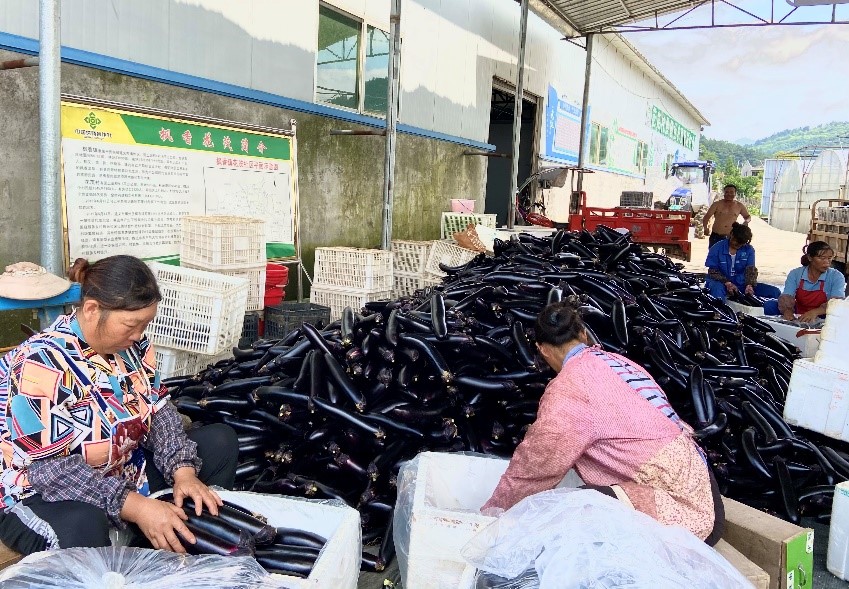 园区内,各类蔬果品种丰富。鲜红的番茄垂挂在枝干上,令人垂涎欲滴;刚丰收的茄子娇艳地聚集在一起,等待装箱运往市场;翠绿的豇豆拼接在一起,形成了一道绿色的瀑布。