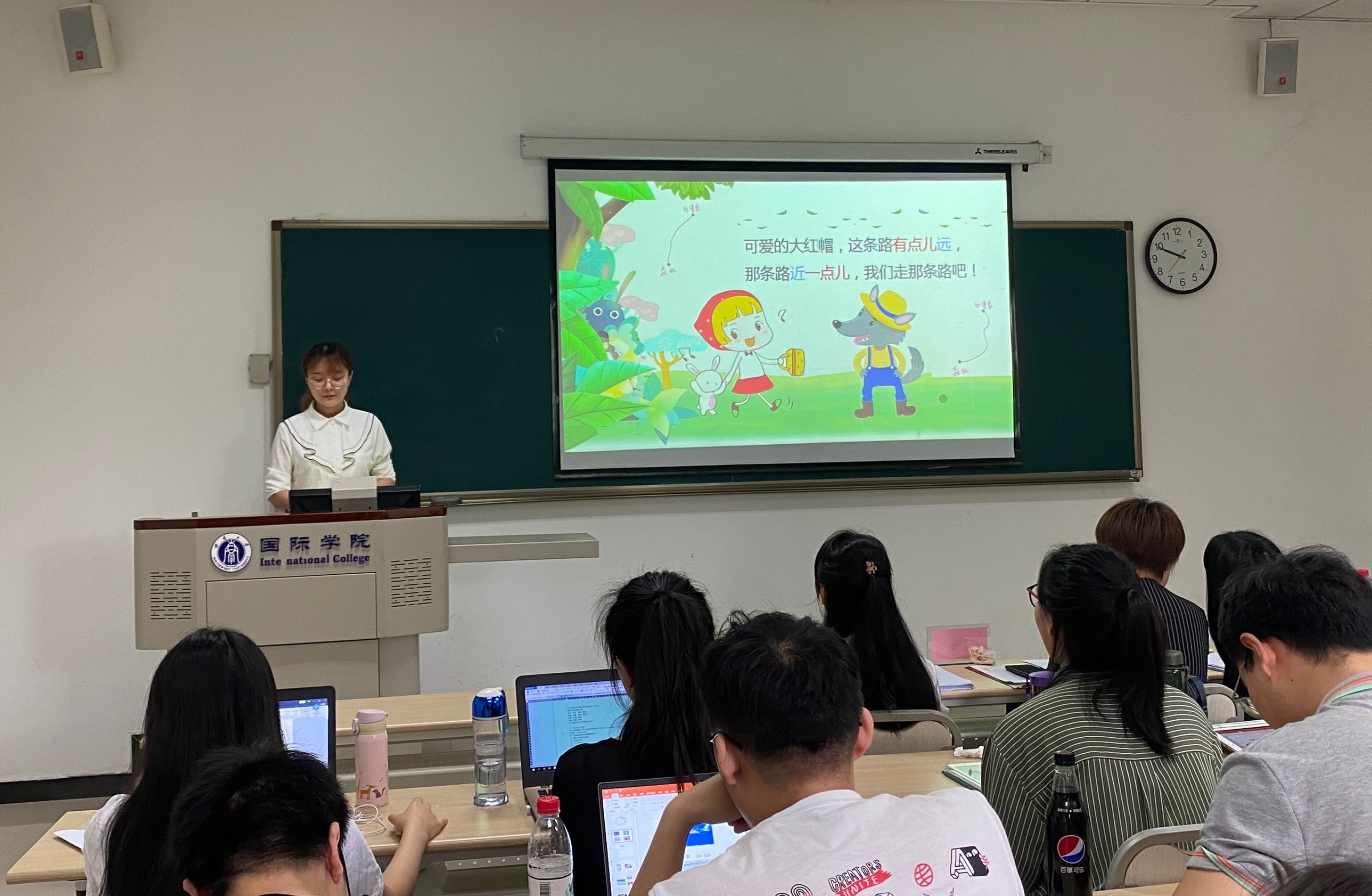 5月19日上午8:30,2020级汉硕生齐聚紫云楼312教室,公司教师涂敏、冯雪、李丹担任本次课堂教学技能大赛的评委,参与比赛的35名同学依次上台展示自己的课堂教学技能。虽然只有短短的五分钟,但是大家都精心设计了自己的教学环节,从课堂导入、知识讲解到活动操练,从教姿教态、教学工具到教学组织,从词汇、语法到文化,可谓异彩纷呈,各有千秋!比赛结束,涂敏老师做了总结发言,分别从不同课型入手,对大家的教学展示做了细致而中肯的点评,提出了优化教学工具、调整教学语言、改进教学活动等建议。