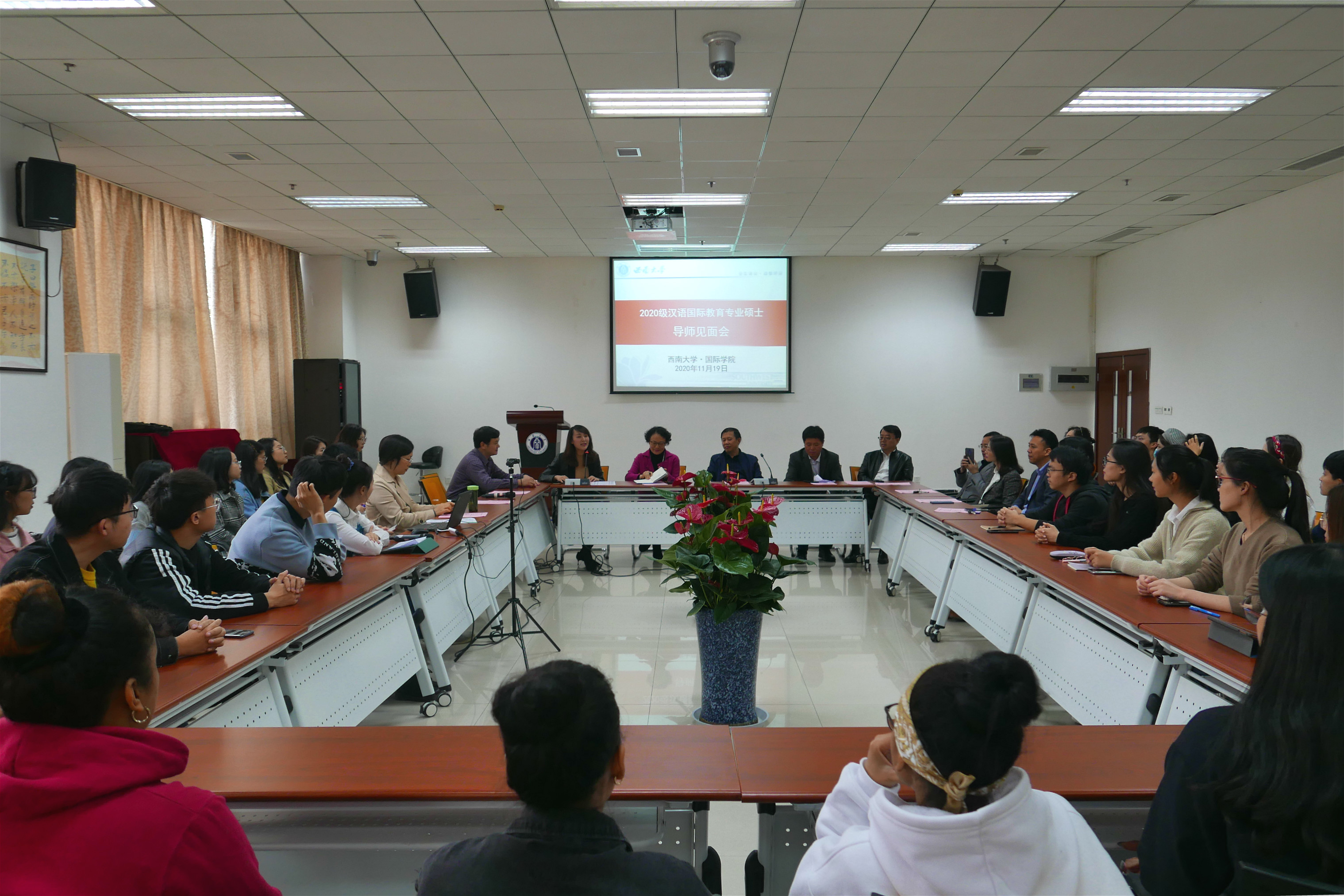 冉冉晨雾重,晖晖冬日微。2020年11月19日下午,紫云楼317教室举行了2020级汉语国际教育专业硕士导师见面会,境外的国际员工同步线上参会。