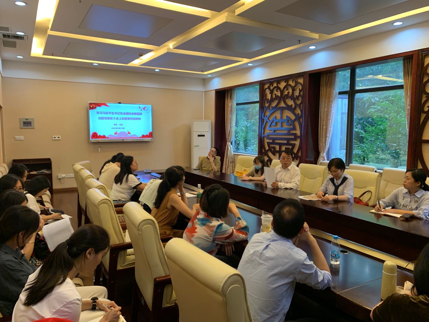 在教师组,青年教师冯雪引导与会教师对习总书记讲话精神进行了认真学习,摘录分享了习总书记讲话中的金句,畅谈了自己的学习感受和体会。她说,在以习总书记为核心的党中央正确领导和部署下,全国人民齐心协力,赢得了抗击新冠肺炎斗争的阶段性胜利,这是全中国人民的骄傲;作为一名青年教师,将始终铭记习总书记的抗疫要求,牢记自己作为对外汉语教师的使命,向国际员工讲好中国故事、传递中国声音和正能量!其他老师也纷纷表示,在以美国为首的个别西方国家甩锅抹黑中国、无底线丧心病狂围堵遏制中国和平崛起的背景下,我们一定要以不屈不挠的民族精神、坚不可摧的中国力量、海纳百川的大国担当予以应对,团结一心,不断奋进,早日实现中华民族的伟大复兴之梦,构建起多元、多向的美美与共的人类命运共同体。