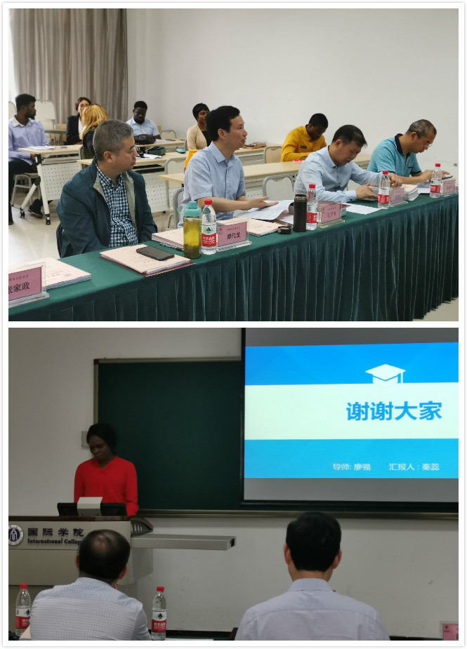 委员交流结束后,答辩正式开始。上午9:00-12:30,线下答辩在紫云楼312教室进行,何洁和来自尼日利亚的宋珂等9名在校中外员工依次参加了答辩;下午1:30-5:30,线上答辩在紫云楼304会议室进行,陈希、孟栩可和来自泰国、越南、尼日利亚等国家的8名中外员工依次远程接入钉钉视频会议进行论文PPT展示与陈述,并回答了答辩委员会委员提出的问题。