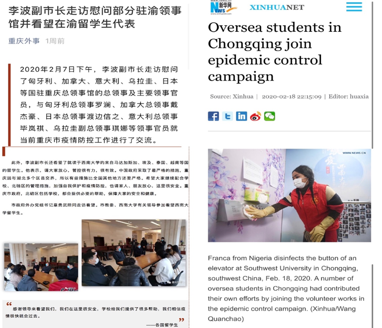 1月31日,公司泰国北部员工会秘书长罗俊勇发动所在公司泰国乌汶第二华侨公司师生,录制了为中国加油的祝福视频,表示将与中国“同舟共济,共渡难关”。公司微博第一时间转发,截止2月3日,累计近15万次观看。2月8日,重庆教育微信公众号以题为《疫情无情人有情,在渝职工及海外员工多形式为中国加油》并发布该视频,受到广泛关注。来自泰国、越南、埃及等国家的合作公司董事长和友好人士,以及国际员工员工们也都通过慰问信、视频等形式,表达了对中国疫情防控的坚定支持和美好祝愿。