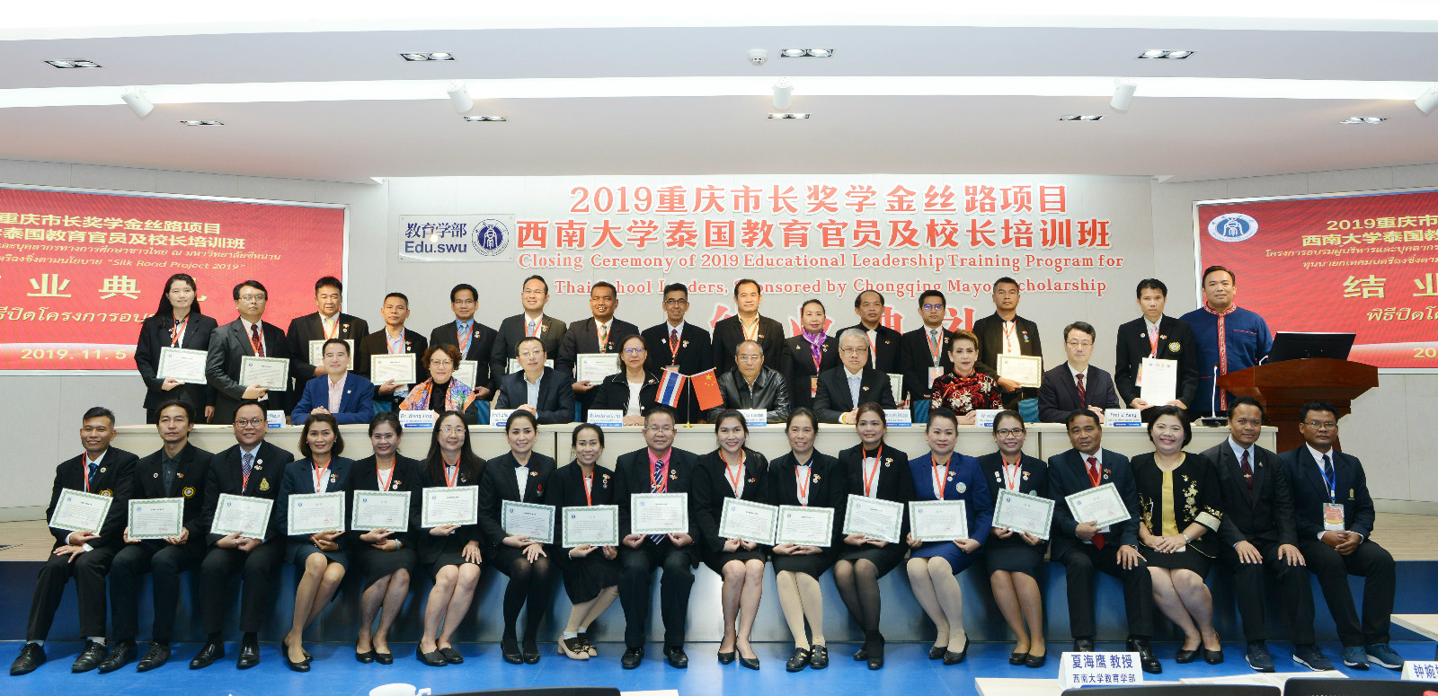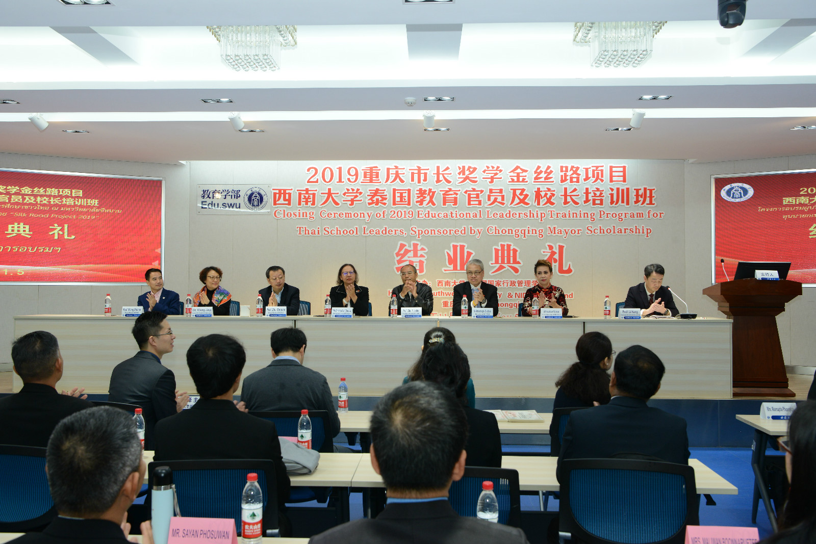 11月5日上午,2019年重庆市长奖学金丝路项目---“bevictor1946韦德官网泰国教育官员及董事长培训班”结业典礼在教育学部举行。泰国教育部次长杜丽亚、泰国教育行政管理公司经理萨蔡童、bevictor1946韦德官网董事长助理褚远辉、教育学部部长朱德全、bevictor1946韦德官网经理王静出席典礼,项目班主任和相关工作人员,以及30位来自泰国的教育官员与职业院校、中小学董事长参加典礼。