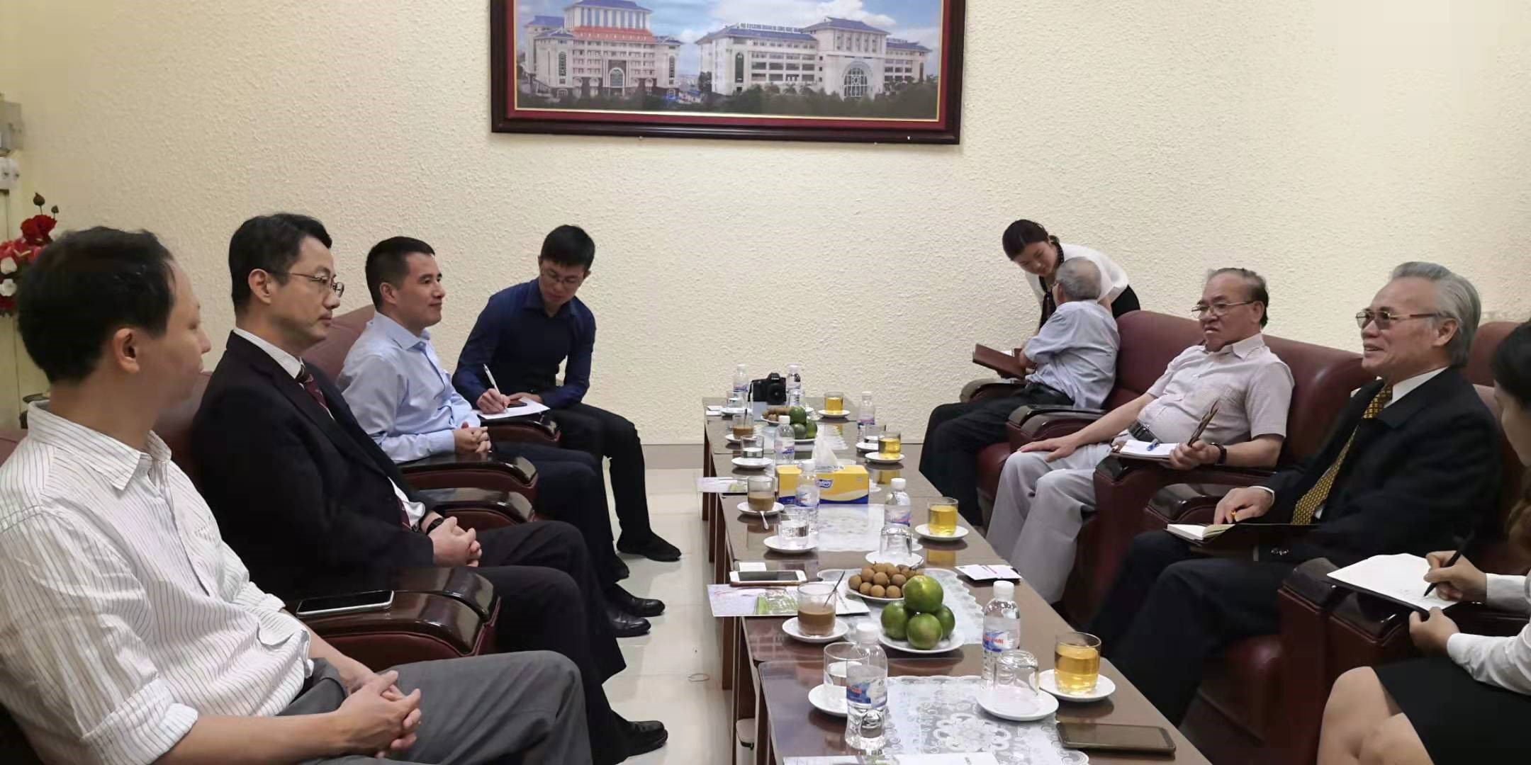 8月27日,代表团一行访问了越南商业技术大学,并与该校副董事长Tran Duc Minh先生、国际处副处长Nguyen Ba Phuc先生、Nguyen Xuan Dau先生、中日文系主任裴清博士等进行了合作洽谈。在简要介绍了公司情况后,双方就汉语专业联合培养、汉语国际教育硕士专业境外办学、短期访学团组来访、公司来华访问团等事项进行了首次洽谈。会后,代表团一行在工作人员的带领下参观该校校园。