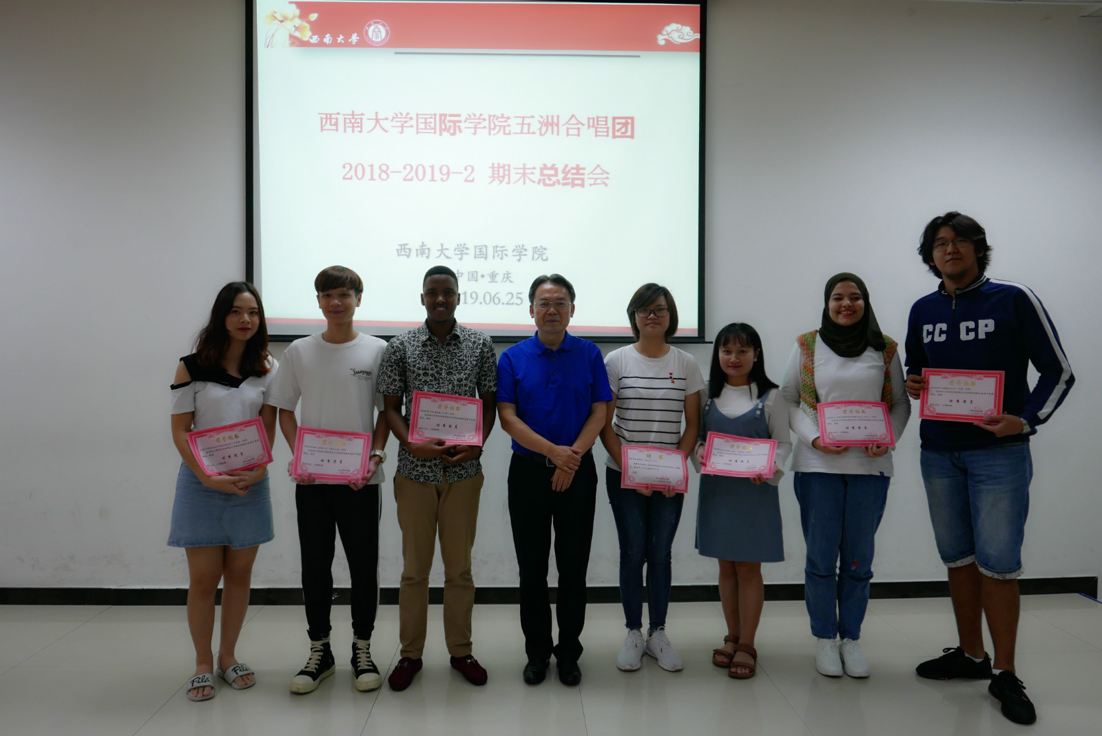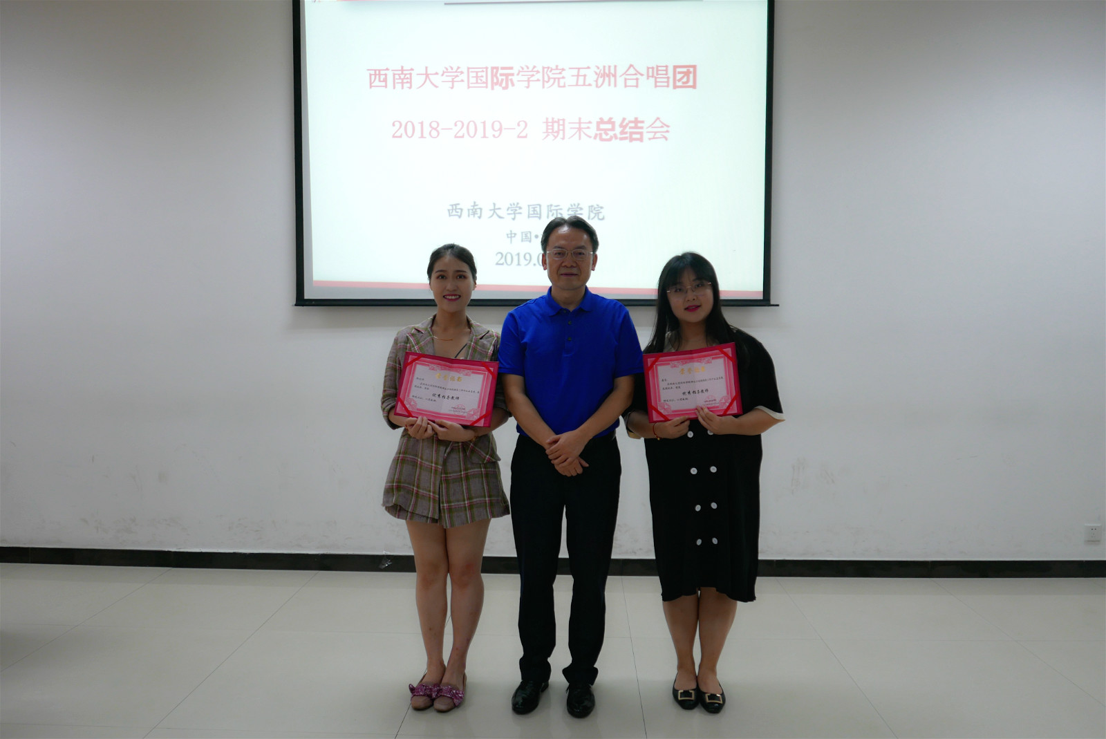 最后,刘猛书记为合唱团表现优异的团员、艺术指导及合唱指挥颁发了“优秀团员”“优秀指导教师”的荣誉证书,并为杜氏玉(越南)同学颁发了合唱团副团长聘书。