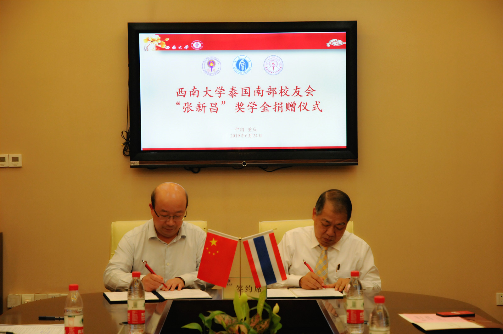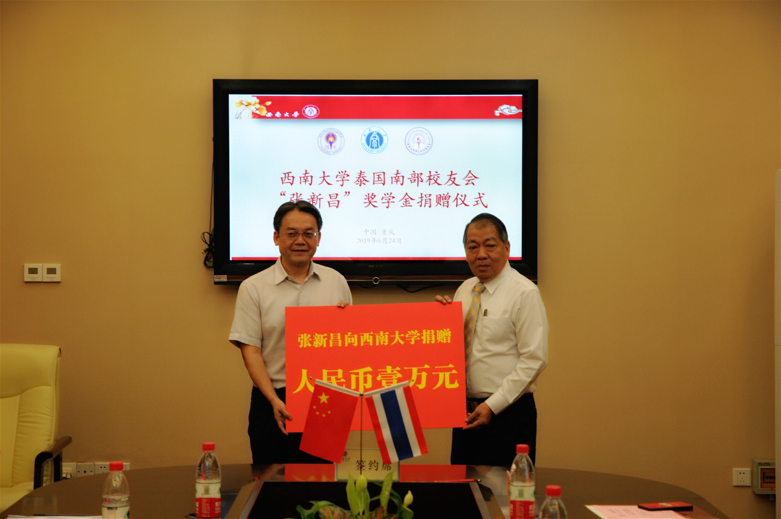 在一片热烈的掌声中,受赠双方代表龚常智秘书长和张新昌先生 共同签订了捐赠协议。为支持bevictor1946韦德官网来华留学教育事业的发展,感谢bevictor1946韦德官网对国际员工的精心培养,张新昌先生向公司捐赠1万元人民币,设立泰国员工会“张新昌奖学金”,用以奖励品学兼优的泰国南部员工。