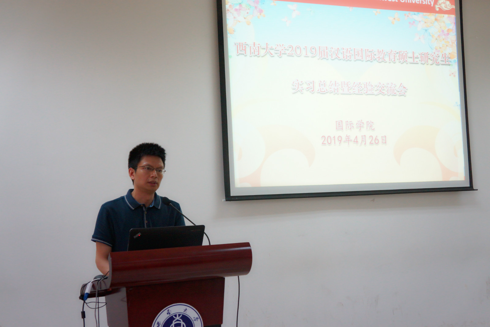 会议在实习纪念短片中拉开了序幕。孔敬大学孔子公司实习点代表陈婷婷,泰国正大管理公司实习基地代表邱雨晴,韩国蔚山大学和仁济大学实习点代表陈玉虬,捷克帕拉茨基大学实习点代表张释允以及日本广岛市立大学代表王梅鲜依次进行了实习汇报。职工班的权景珠同学也代表职工班进行了实习汇报。