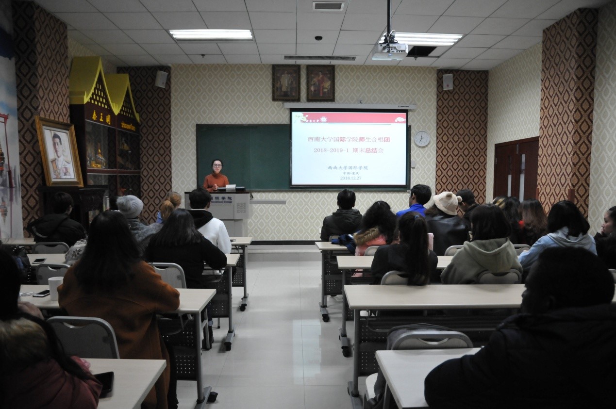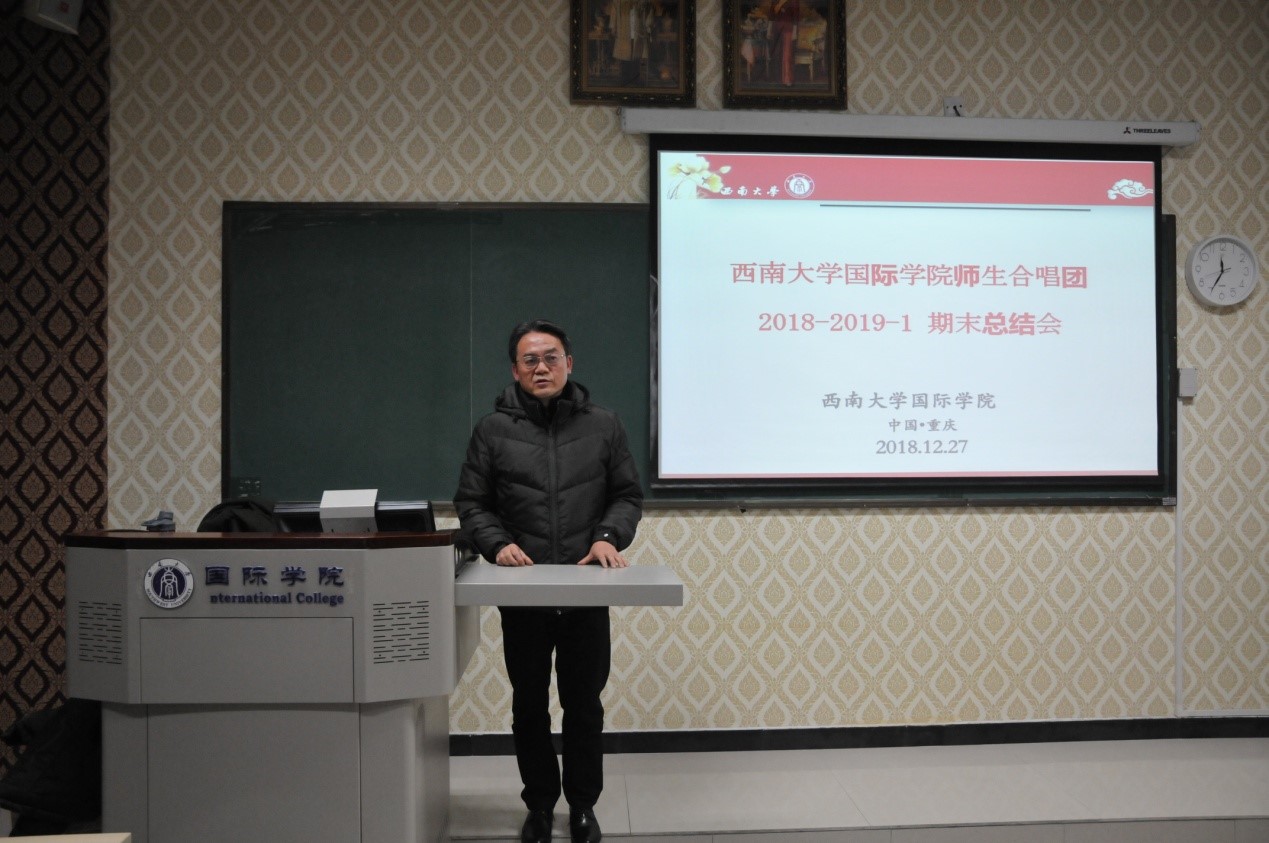 刘猛书记做总结发言。他首先对合唱团演出成功表示祝贺,然后提出了三点希望:一是坚持每周的排练,严格遵守纪律,服从指导老师的安排;二是积极主动学习中文歌曲,不仅可以提高汉语水平,还能在更大的舞台上展示自己;三是继续发扬合唱团的合唱精神,团结一致,精益求精,在排练和表演上有更高的追求。