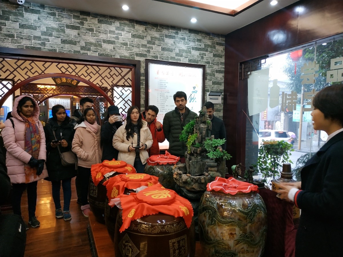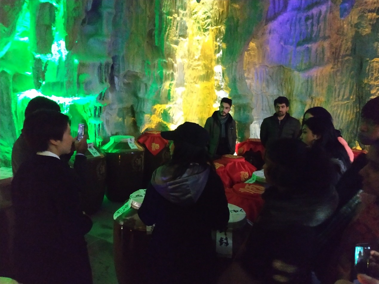 随后,两个班的员工参观了储存酒的窑洞,看到一个个巨大的传统酒坛,闻到空气中弥漫的酒香味,巴基斯坦等国的同学陶醉于其中,戏说着想把酒窖搬回国。