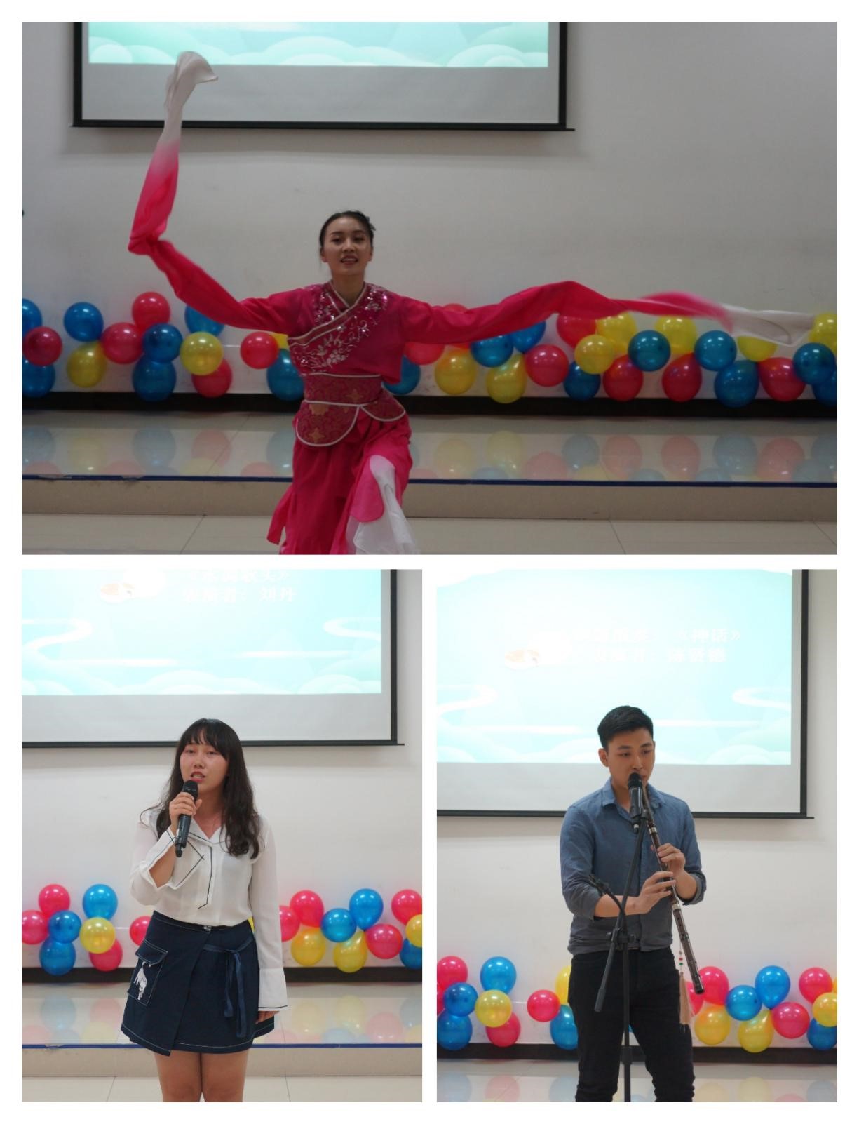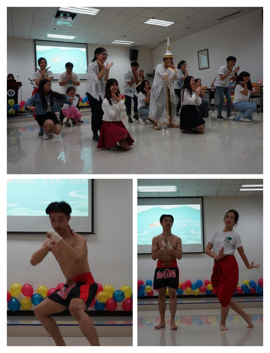 教师致辞之后,活动迎来了第一个精彩的节目,汉硕班员工刘丹伴着一首典雅的歌曲,向大家声情并茂地朗诵了苏轼的《水调歌头》,一句“但愿人长久,千里共婵娟”,让在场同学都置身于皓月当空 、孤高旷远的意境氛围中,无不心驰向往,思绪万千。紧接着,正大班全体员工为大家带来了具有浓浓泰国风情的歌舞表演,曾聪等同学身着泰国传统服装,向众人展示了泰国的服装文化。之后,汉硕班陈贤德同学倚歌而和,用中国传统乐器洞箫为大家吹奏了一曲《神话》,其声呜呜然,如怨如慕,如泣如诉,余音袅袅,不绝如缕,在场诸人无不沉醉其中;此外,汉硕班员工张祖瑶也为大家表演了古筝独奏《丰收锣鼓》,路丽帆同学以曼妙婀娜的舞姿为大家献上一曲《望月》,赢得了在场热烈的掌声。接着,泰国员工孔灵焕、吴浩然为大家带来了舞蹈和泰拳的表演,力量与柔美在这场表演中得到了完美的融合。