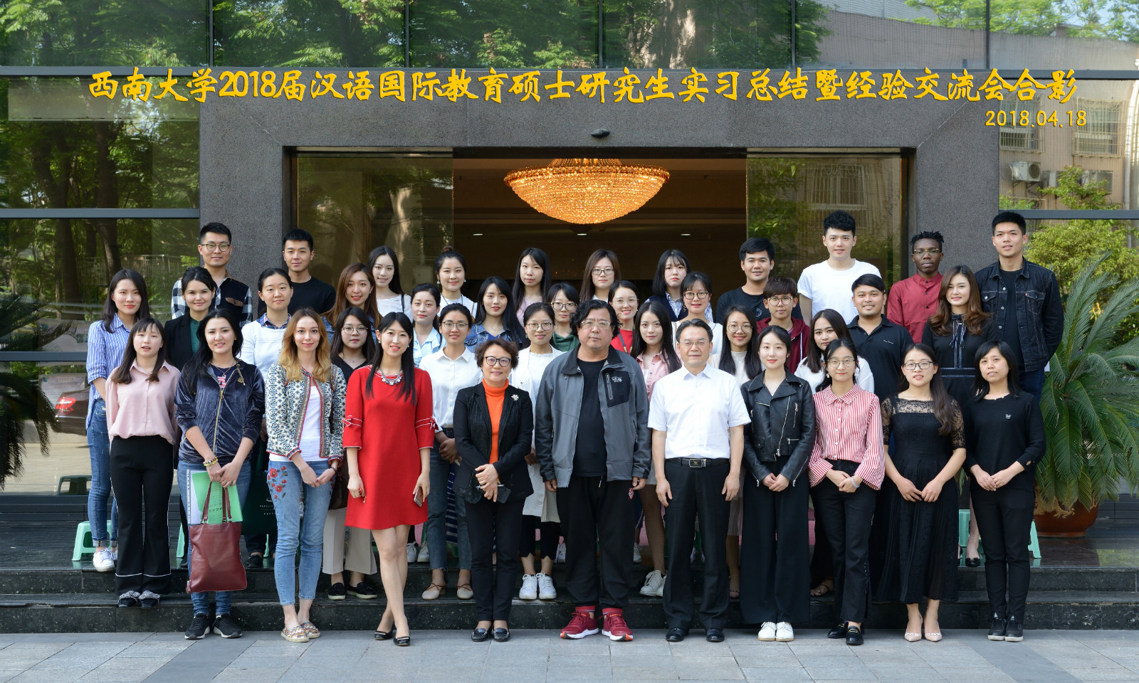 王静经理宣读《关于表彰2016级汉语国际教育硕士优秀实习生的决定》,受表彰的优秀实习生和在场领导一起合影留念。至此,2018届汉语国际教育硕士研究生实习总结会暨经验交流会圆满结束。