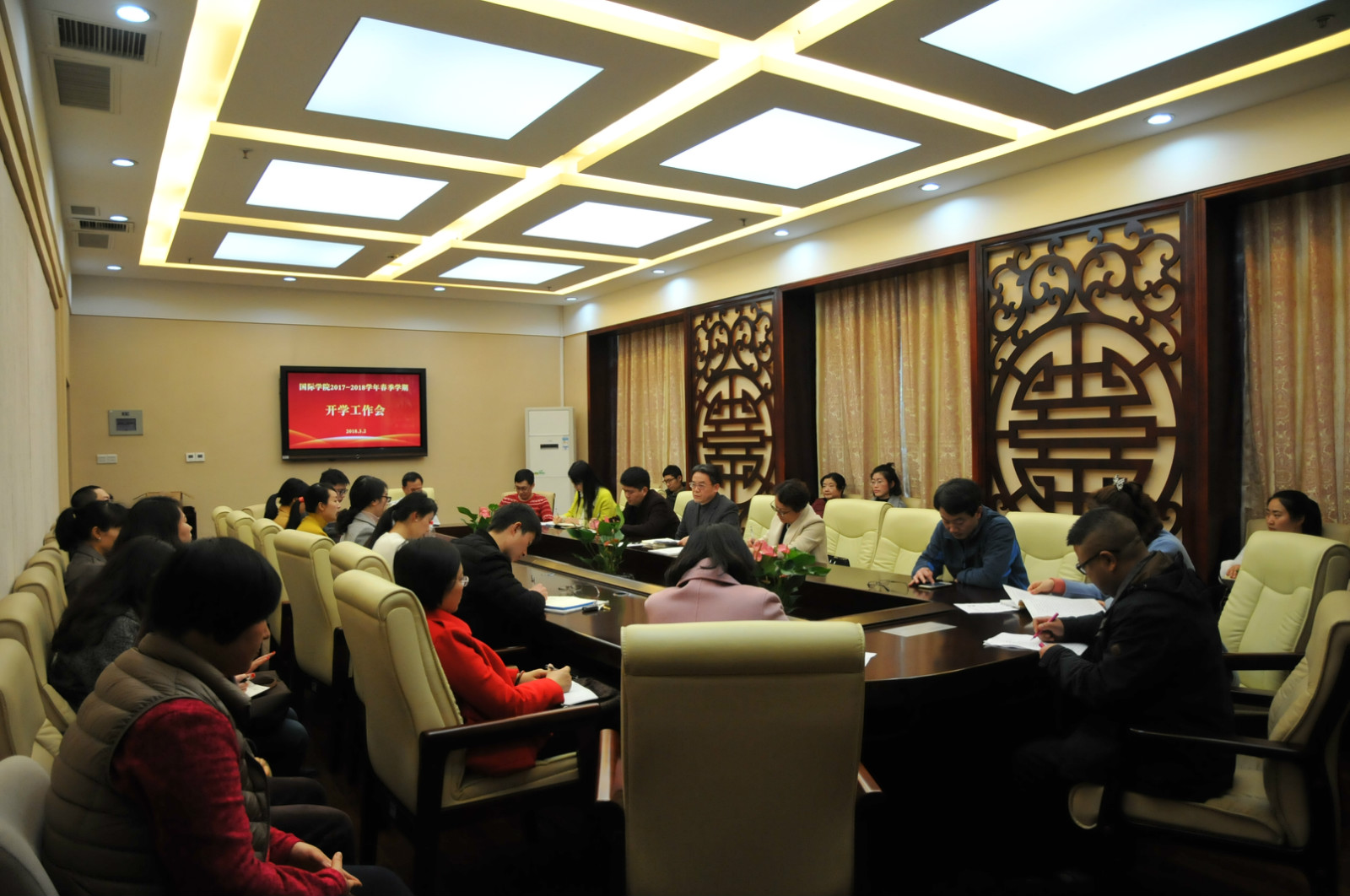2018年3月2日下午3点半,公司2018年春季学期开学工作会议在紫云楼签约室举行,全体教职员工参加会议,会议由刘猛书记主持。