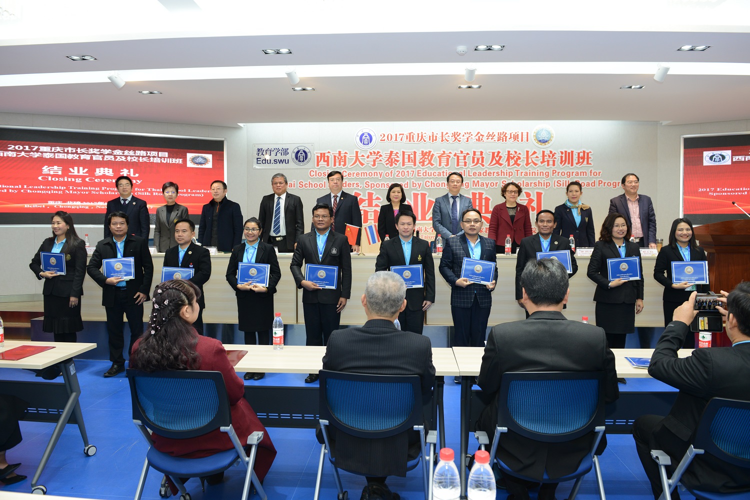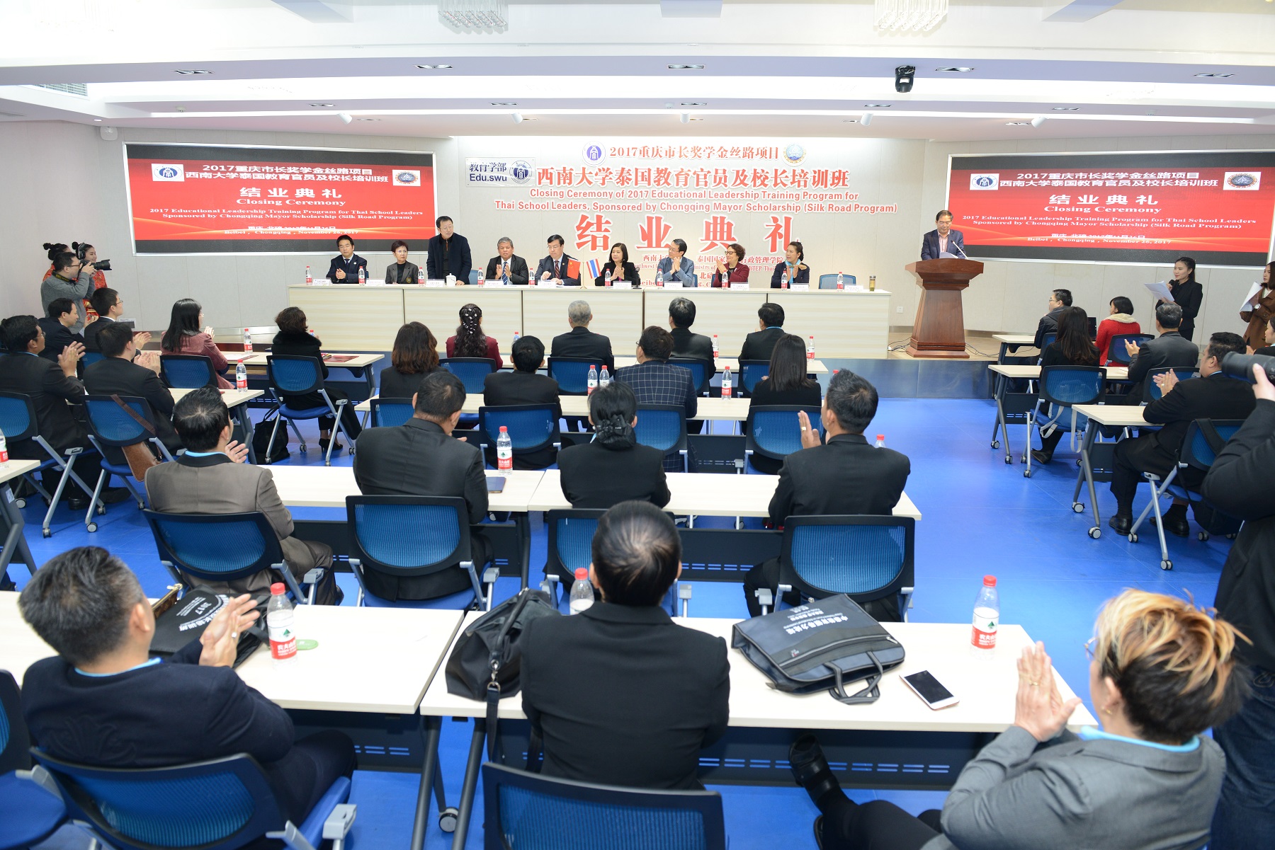 11月26日下午,2017重庆市长奖学金丝路项目“泰国教育官员及董事长培训”结业典礼在教育学部举行。泰国教育部教育总督察班迪·西铺汤昆博士、泰王国驻成都总领事馆潘媞葩总领事、泰国国家教育行政管理公司副经理登威·姜塔卡博士、规划处布恩塔薇·阿伦玛处长、公司董事长助理王进军教授、重庆市教委国际处李斌副处长以及教育学部、bevictor1946韦德官网相关领导出席。该项目的33名来自泰国的教育官员及中小学董事长以及项目班主任和相关人员参加。典礼由教育学部韩仁友书记主持。