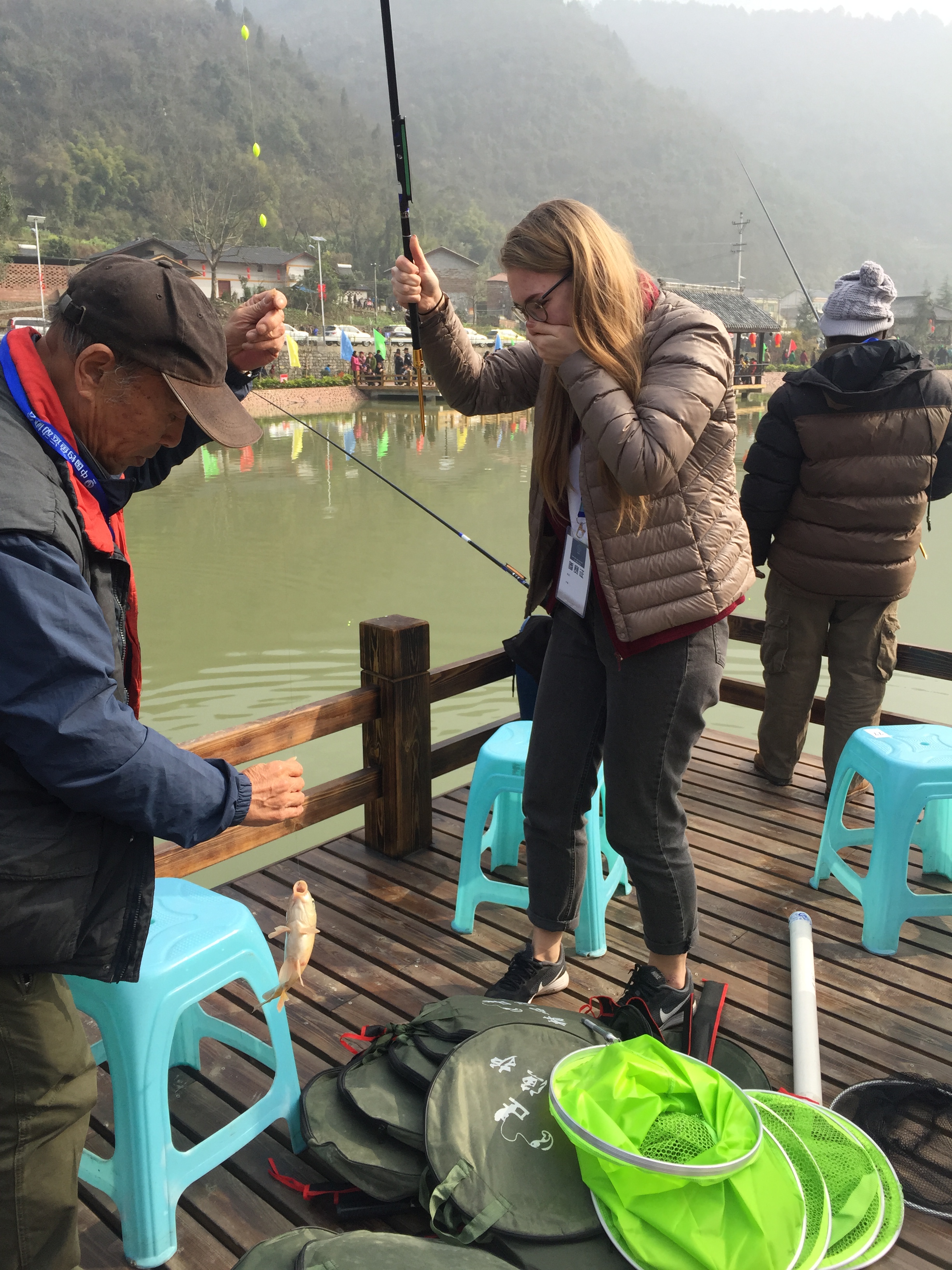 此次钓鱼比赛设在风景优雅、诗意盎然的万盛经开区关坝镇凉风村,参赛者在努力比赛的同时,尽情领略了凉风村的优美景色。职工们进入国际垂钓赛场后,便在万盛经开区钓鱼协会的专业选手的帮助下,开始摆放鱼竿、整理鱼线、制作饵料......井然有序的做着赛前准备。比赛开始的号令一下,职工选手们纷纷勾上鱼饵,甩下鱼竿,来自坦桑尼亚的Mohamed旗开得胜,刚把鱼钩放下池塘就钓上来一条大鱼,为选手的比赛开了个好头,其他职工们也不甘示弱,放下鱼钩,不一小会儿鱼儿就上钩了。钓鱼比赛期间,同学们表现得非常专注。最后在这一场3小时的钓鱼比赛中,来自俄罗斯的Polina获得了冠军,其他职工们的成绩也非常不错,都获得了现场裁判和组委会的认可。