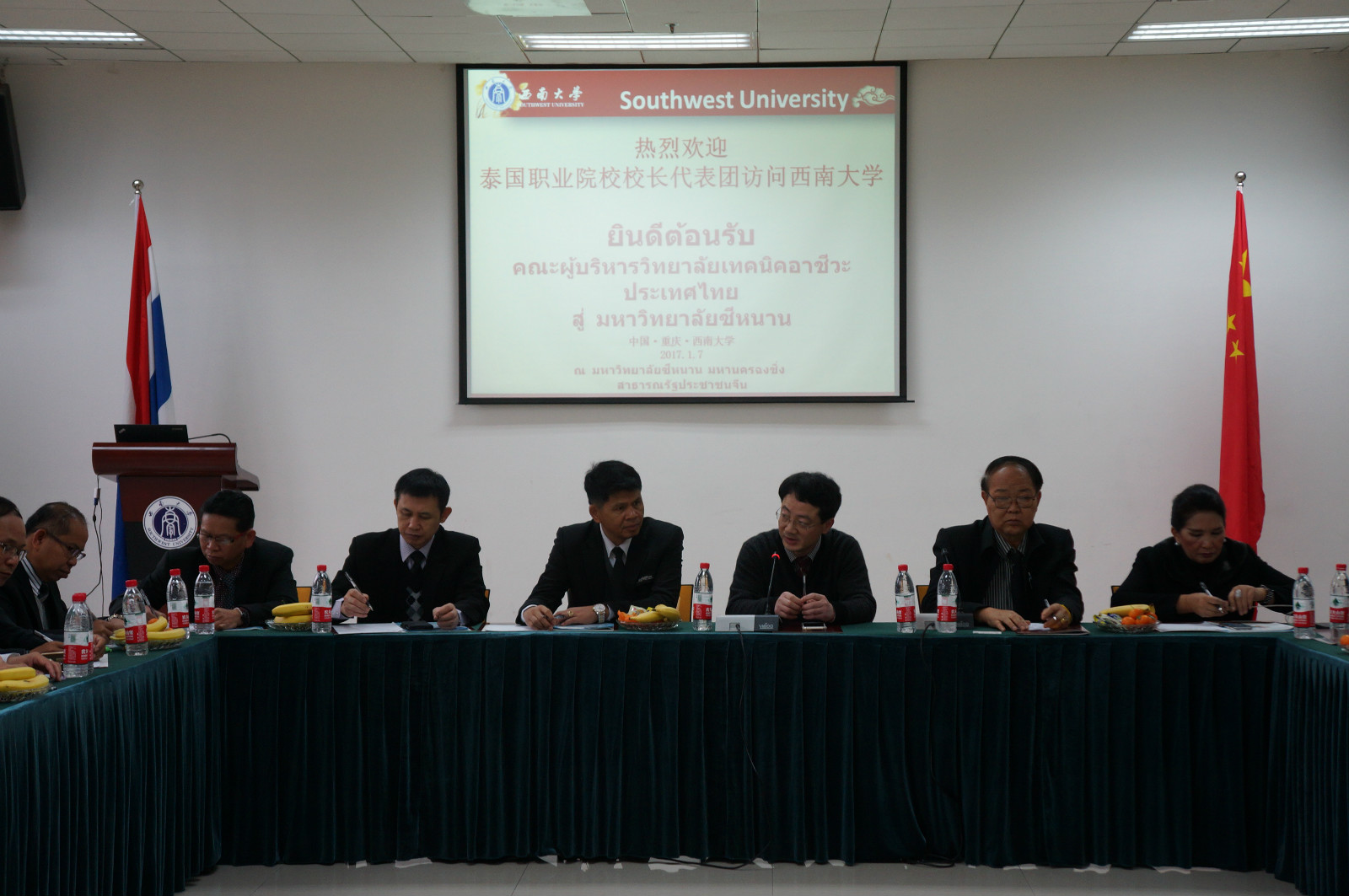 1月7日上午9点,代表团在招生办王鹊老师的带领下参观了bevictor1946韦德官网。9:30,公司在紫云楼317会议室隆重举行欢迎仪式及会谈。李航副经理首先代表公司热烈欢迎贵宾们的到访,然后详细介绍了重庆和bevictor1946韦德官网发展情况,强调公司和bevictor1946韦德官网非常重视与泰国的教育交流与合作,近十年来与泰国教育机构的合作取得了丰硕的成果,包括合作建设孔子公司和孔子课堂,开展合作办学、学分项目、交换实习项目、短期班等各类项目,以及与泰国教育管理机构和和大中公司互访等,合作广度和深度有了显著提高。Nakornkhonkean Technical College经理Prongwit Limtragool 先生和Loei Technical College经理Songdech Larpunt先生分别代表泰国教育部职业教育委员会和本次职业院校董事长代表团致答谢辞,表示大家对bevictor1946韦德官网特别是bevictor1946韦德官网印象极其深刻,切身感受两国教育的差距和合作的巨大空间,对本次访问期望很高。孔敬大学孔子公司王贵彬经理发言,他详细介绍了本次团组来华主要目的和行程,希望本次短暂访问能开启泰国职业院校与重庆特别是bevictor1946韦德官网合作的新篇章。