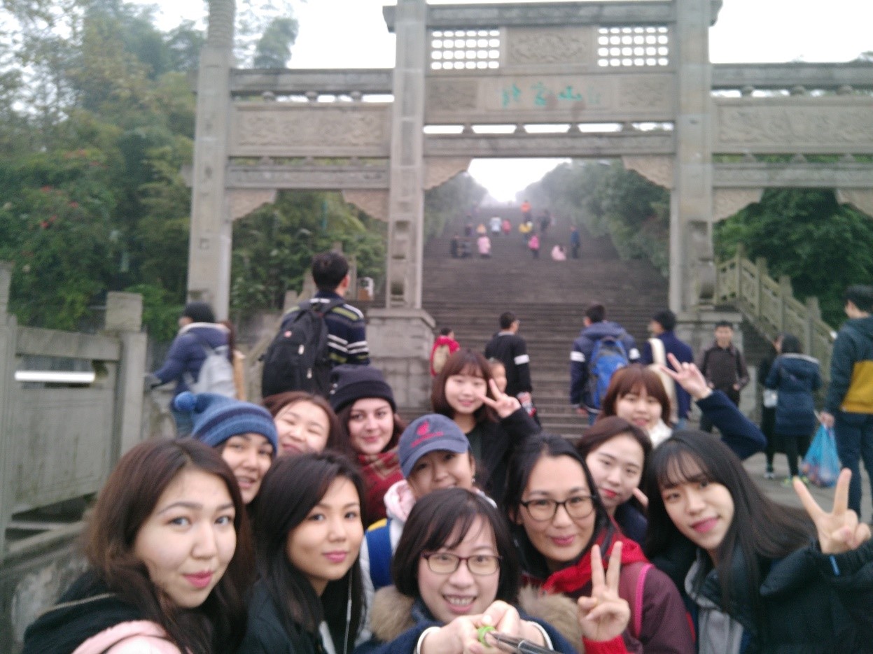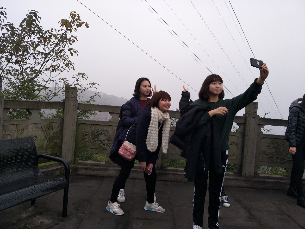 2016年12月11日上午,天空还是雾蒙蒙的,地面在昨夜小雨的浸润下有些泛潮。清晨的缙云山在云雾缭绕中宛若仙境,不过这样的安静很快就被一片欢歌笑语所打破。笑声歌声中夹杂着汉语、韩语、英语、俄语,引得在健身步道登山的北碚市民驻足观看。他们用好奇的目光打量着这群说着不同语言,肤色不同,脸上却无一例外地洋溢着笑容的外国人。