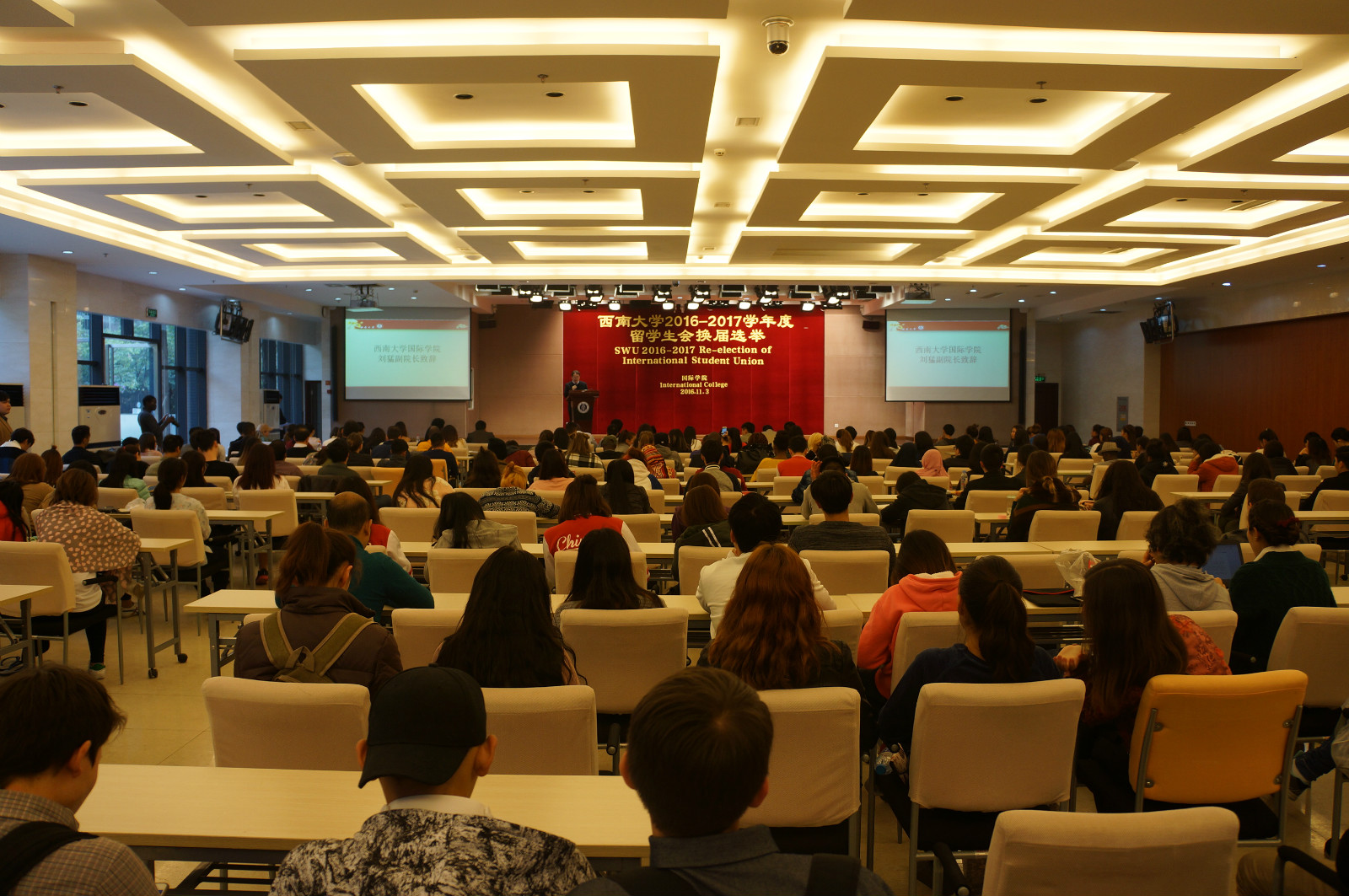 11月4日下午四点,公司2016-2017学年度职工会换届选举大会在bevictor1946韦德官网报告厅举行。来自12个国家的32名候选人就新一届职工会的主席、副主席和秘书等职位展开竞选。公司党委书记刘猛,校员工会主席陈鹏,bevictor1946韦德官网员工工作办公室老师及全校400余名职工参加选举会。
