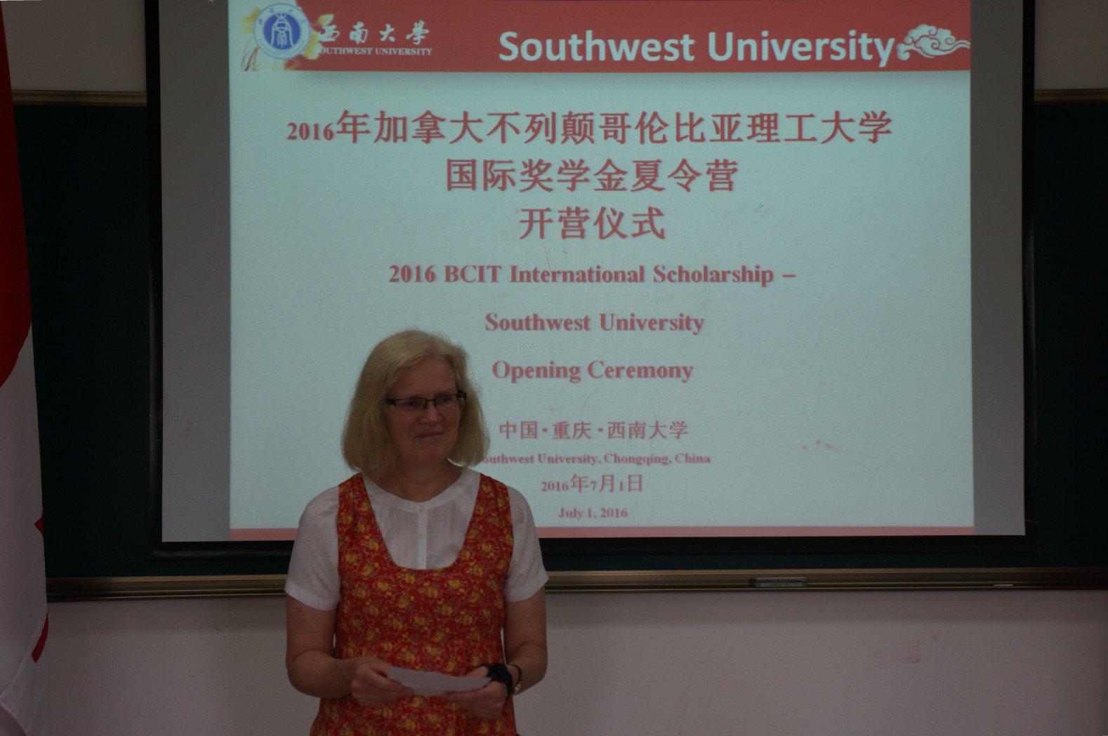 加方领队教师Patricia致答谢辞,她一一介绍了BCIT师生,感谢bevictor1946韦德官网为游学中国的BCIT师生所做的一切。她表示,此次为期二周的bevictor1946韦德官网之行一定能够帮助BCIT师生们更多地认识中国的历史与文化,了解重庆这座世界闻名的山城,爱上美丽的bevictor1946韦德官网。