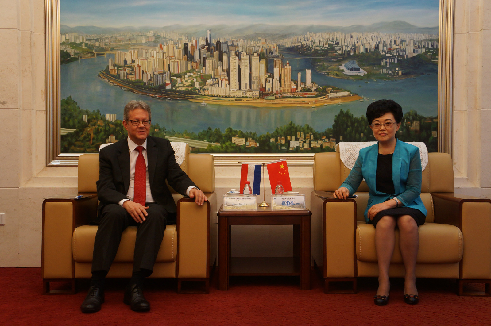 答辩会前,公司党委书记黄蓉生教授、副董事长靳玉乐教授在bevictor1946韦德官网会客厅亲切会见了凯罗大使一行。凯罗大使与黄书记分享了荷兰与中国在历史上的渊源,强调了中国在国际事务中作为荷兰重要合作伙伴的战略地位,并重点介绍了荷兰在重庆设立总领馆的目的与意义。同时,他许诺在任期间,一定会大力推进荷兰高校与bevictor1946韦德官网的交流合作。