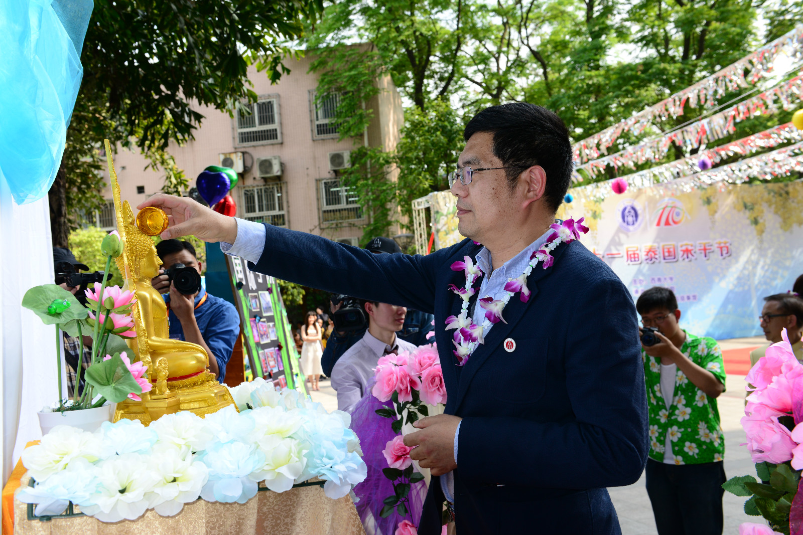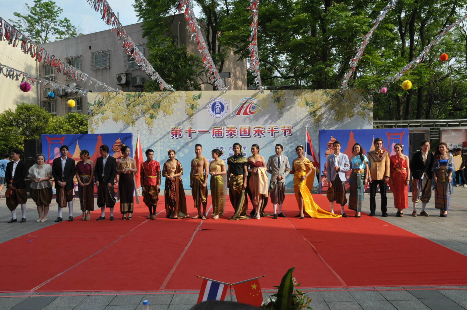 在身着传统泰式裙袍的泰国礼仪引导下,现场嘉宾进行了神圣庄严的浴佛仪式。仪式完毕后,5名来自各公司的泰国职工精心准备的歌舞节目引发了全场热烈掌声,而由来自泰国,韩国,哈萨克斯坦等国的职工参与的“宋干先生”与“宋干小姐”的评选更是将气氛推至高潮。最后,在激情澎湃的音乐中,全场师生尽情泼水,互道祝福,享受着传统的泰历新年带来的愉悦。
