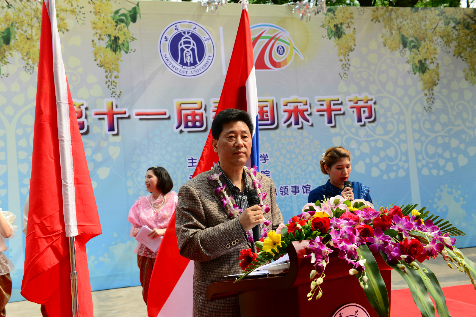 副董事长靳玉乐首先致辞,代表公司向出席活动的各位领导和来宾表示欢迎。他说,公司举办宋干节,不仅是为了给来自五湖四海的同学们呈现一个泰式风情新年,更是为了给所有在校的泰国同学留下一份美好的回忆,传达公司对他们的无限关爱和祝福,希望泰国同学在泰历新年努力奋斗,茁壮成长,以实际行动迎接公司合并组建10周年暨办学110周年的到来。