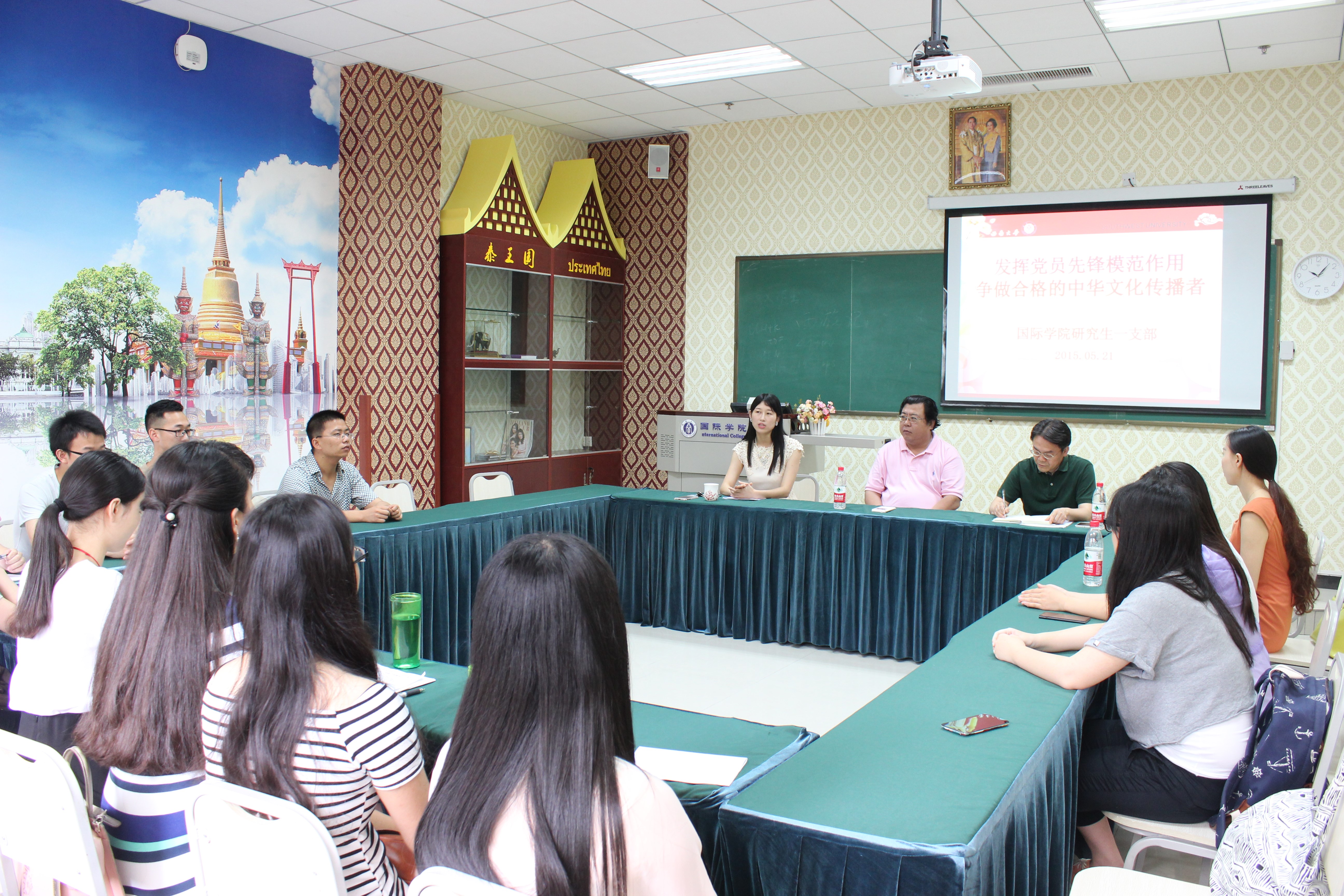 组织生活会由支部书记陈雨曦主持。陈雨曦首先介绍了研究生一支部的党员情况,并结合汉语国际教育专业,对本次组织生活会的主题进行了解读。随后,各员工党员结合自己的专业实际和海外教学经历踊跃发言。他们阐述了作为汉语国际教育硕士,如何在海外汉语教学实习中充分发挥党员先锋模范作用;在尊重当地文化的同时,如何与外国员工分享交流中国的优秀文化,做合格的中华文化传播者。
