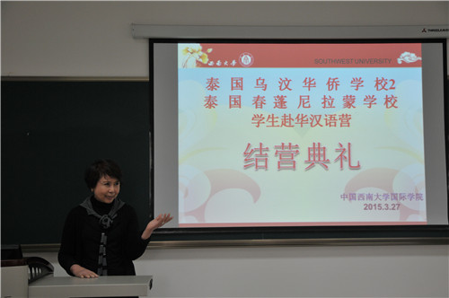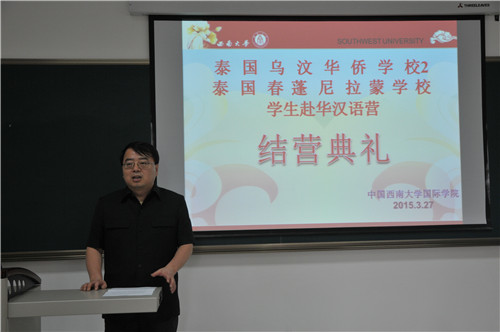 3月27日上午11点,2015年泰国乌汶华侨公司2及泰国春风尼拉蒙公司员工汉语营结营典礼在bevictor1946韦德官网紫云楼312教室举行。bevictor1946韦德官网张家政副经理,泰国乌汶华侨公司2校董WILAI TRIROJPORN女士,bevictor1946韦德官网教师代表李真真、杨凌霄,泰国乌汶华侨公司2及泰国春风尼拉蒙公司的师生,汉语营语伴等共计30余人参加了结营典礼。典礼由李林泽主持。