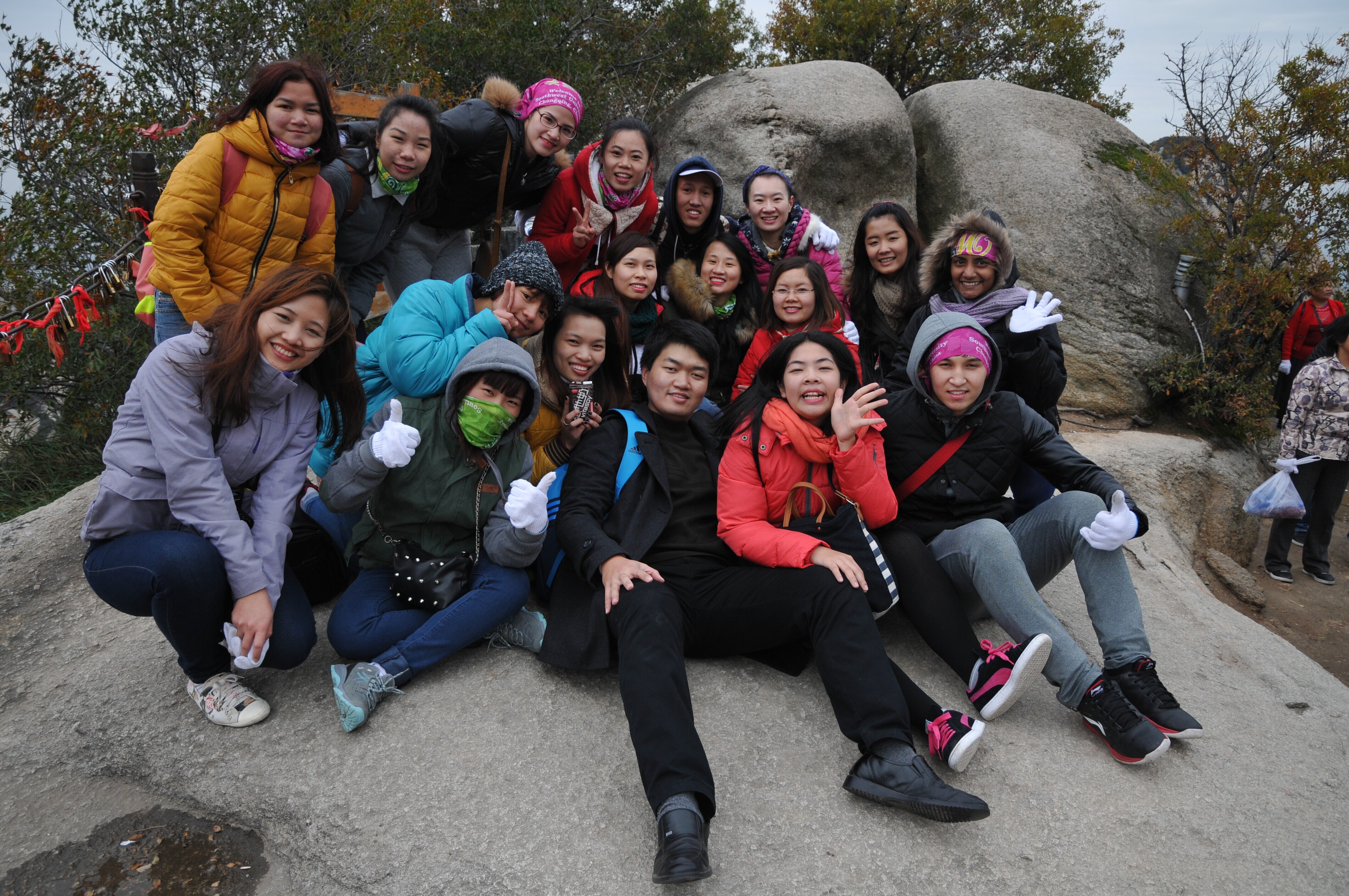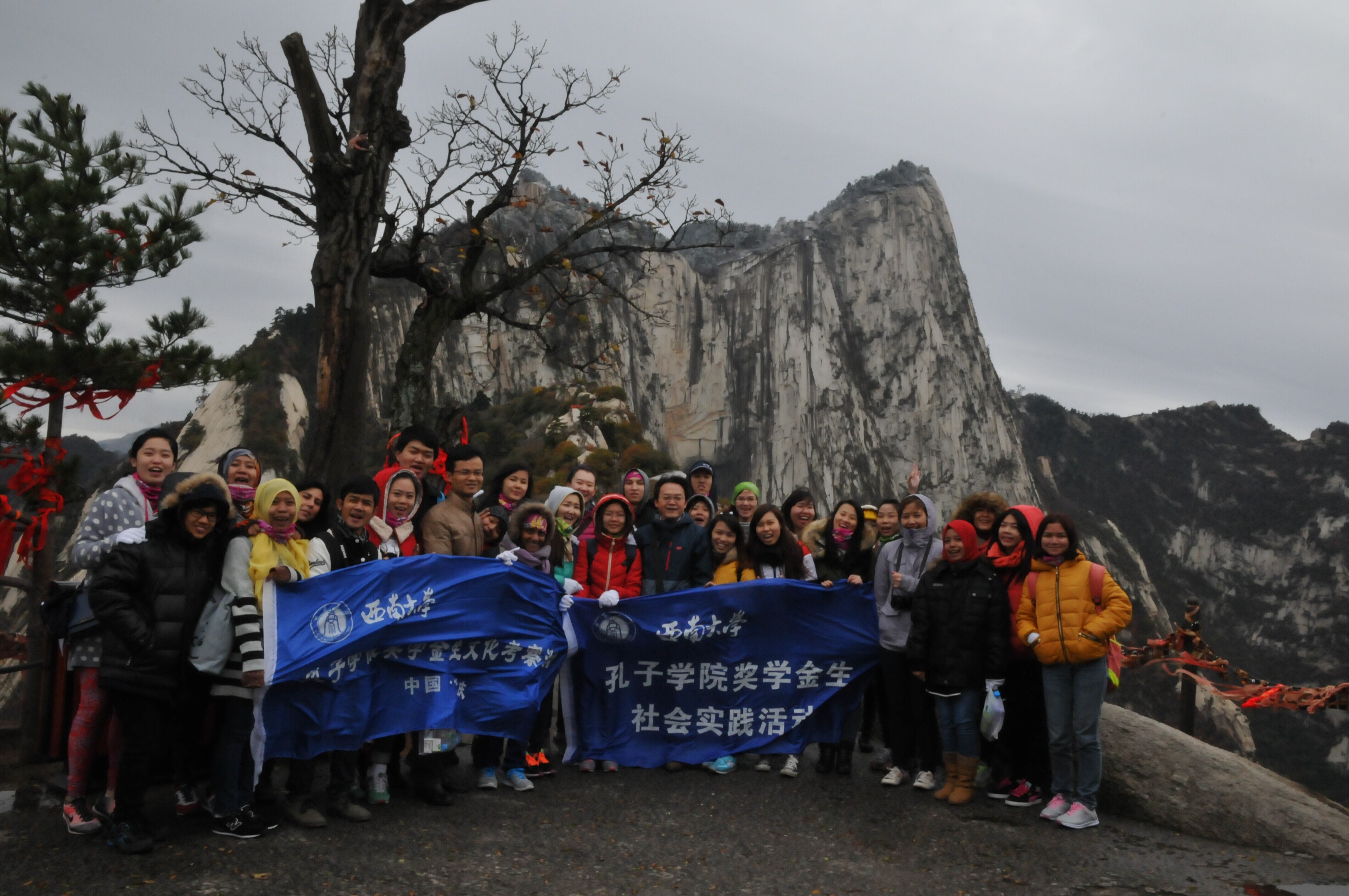 31日同学们一起前往五岳之中以险著称的华山。高山巍峨,光是在景区之外已让同学们惊叹不已。在爬上北峰和西峰后,同学们更是实地感受了金庸先生笔下的“华山论剑”之所和华山2014年的第一场雪。下山后,同学们有幸品尝了陕西的国宴“饺子宴”,十几种由不同面皮和不同馅心制作而成的饺子,在古代是进贡帝王的御膳,让同学们在登山后一饱口福,疲惫之感烟消云散。