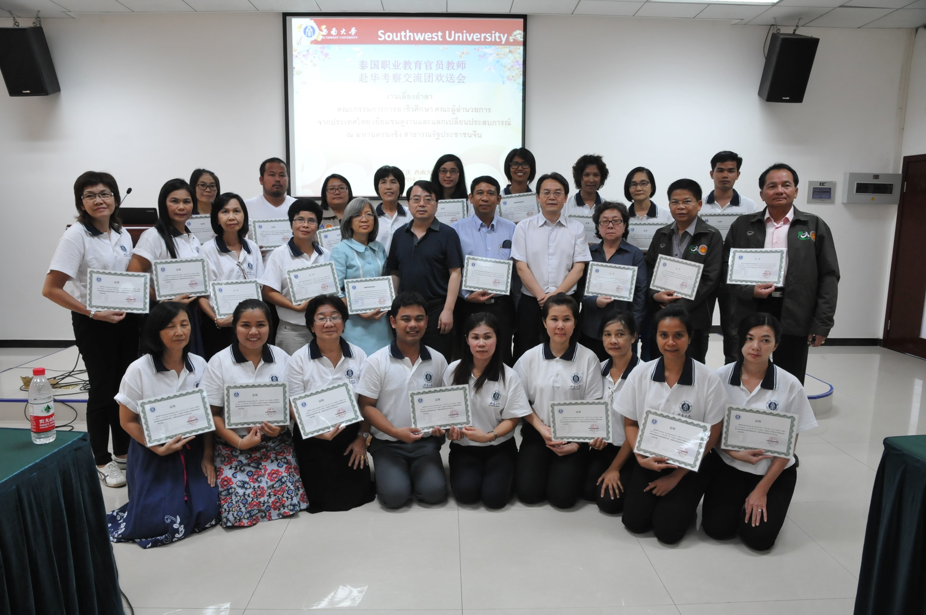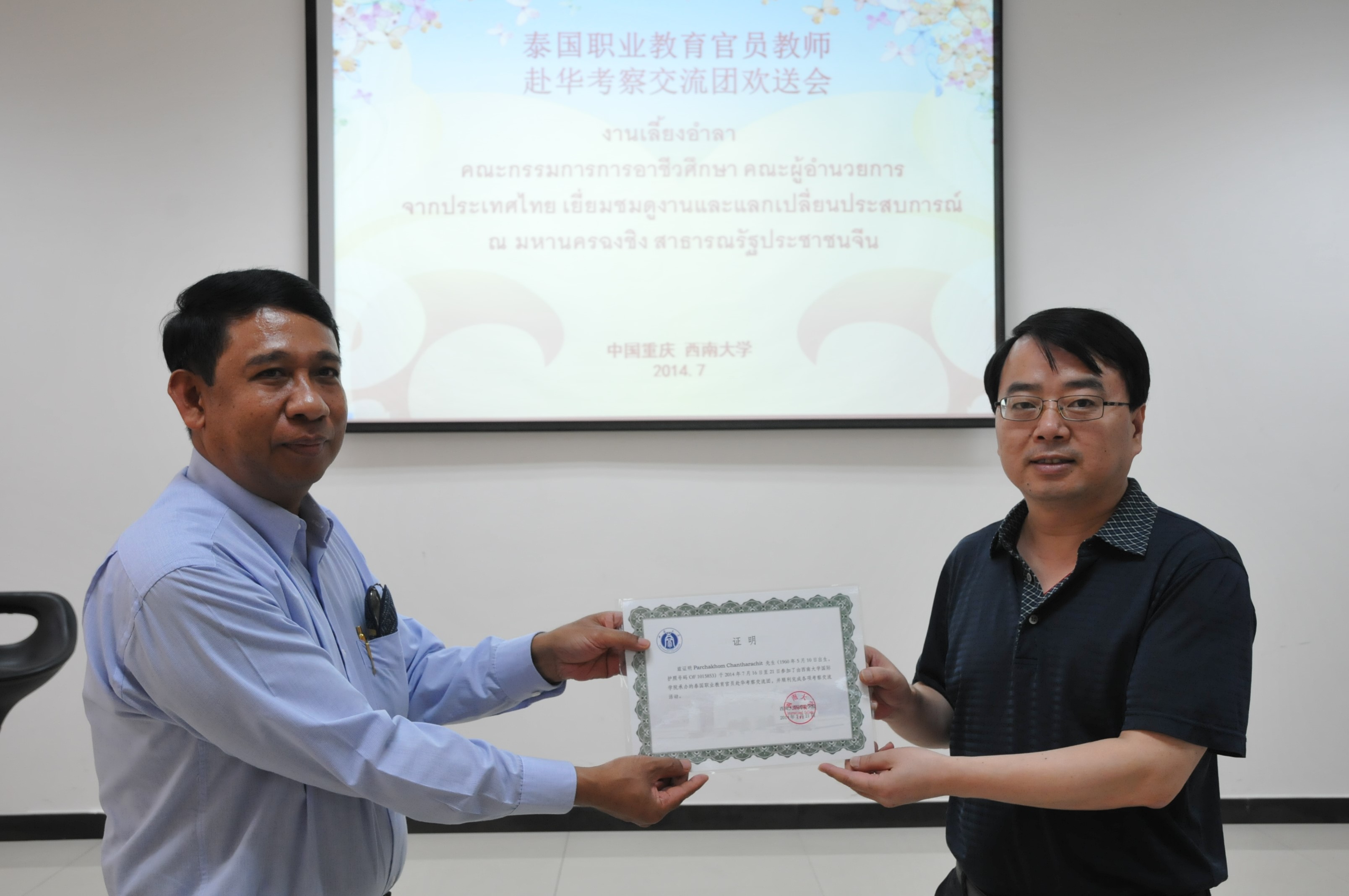 刘猛书记和张家政副经理向泰方考察团成员颁发结业证书并合影留念。至此,2014年泰国职业教育委员会董事长暨教师赴华考察交流团活动画上圆满句号。