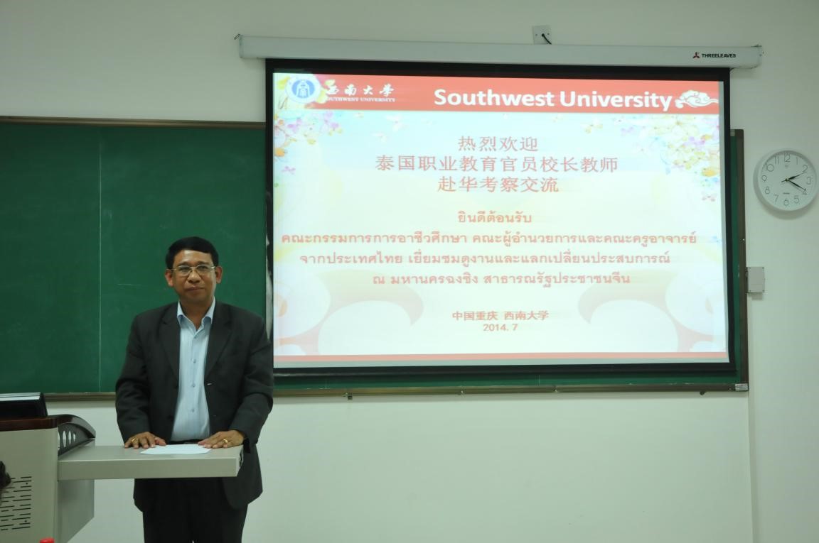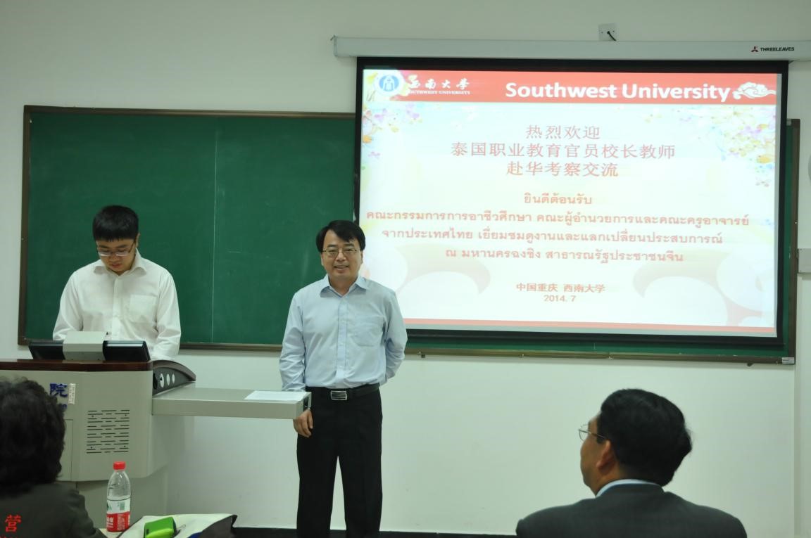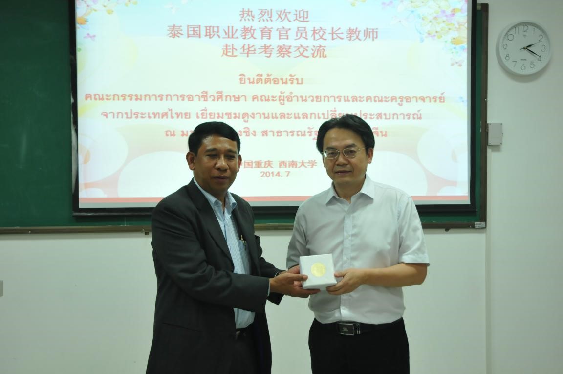 2014年7月16日下午3点,泰国职业教育委员会董事长和教师赴华考察团开班典礼在紫云楼201教室隆重举行。公司党总支书记兼副经理刘猛、副经理张家政出席典礼。