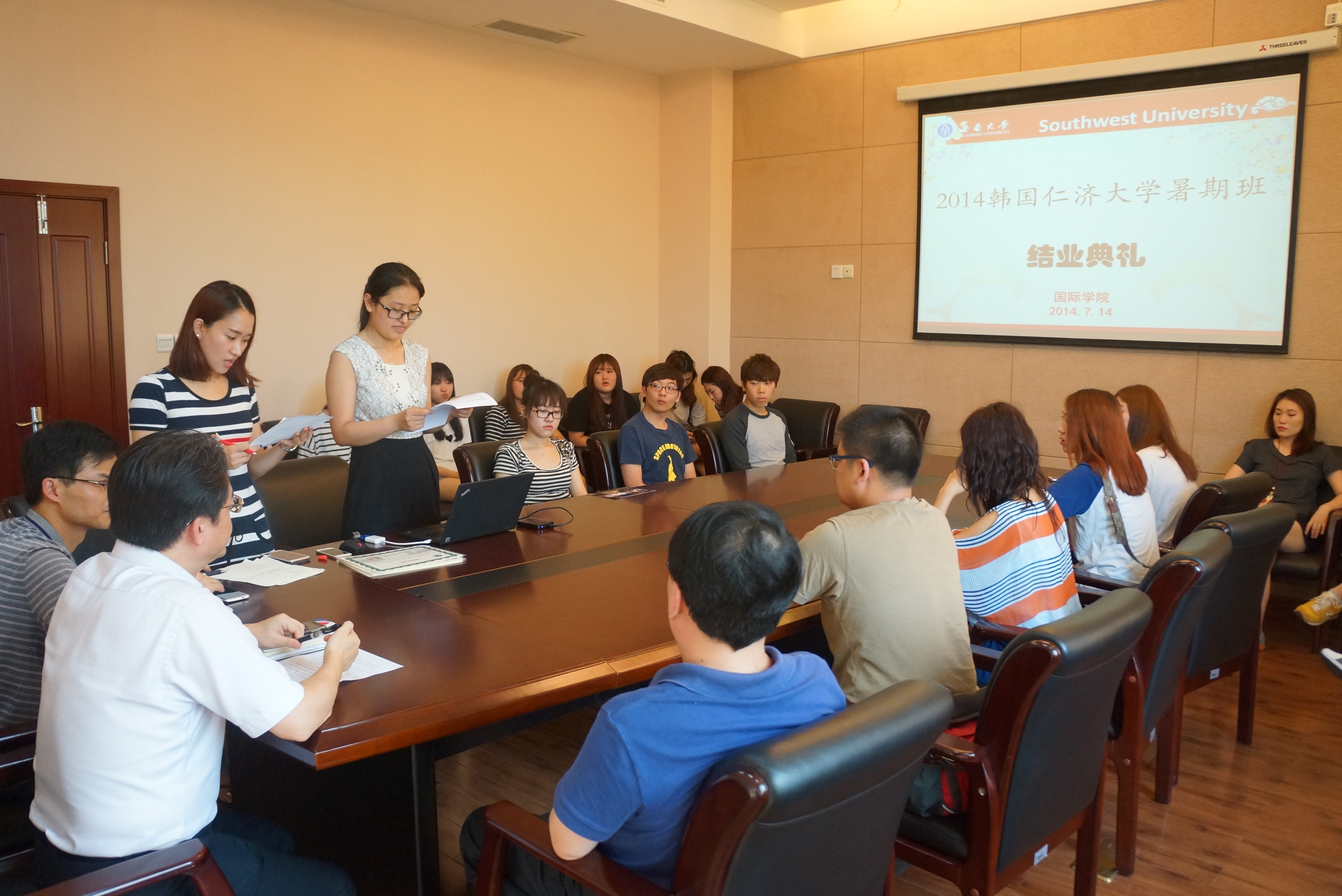 7月14日下午,2014年韩国仁济大学暑期班结业典礼在bevictor1946韦德官网310会议室隆重召开。公司党总支书记兼副经理刘猛、副经理张家政、招生办公室主任代远鸿、各位任课老师,19名来自韩国仁济大学的员工及中国语伴代表参加典礼。