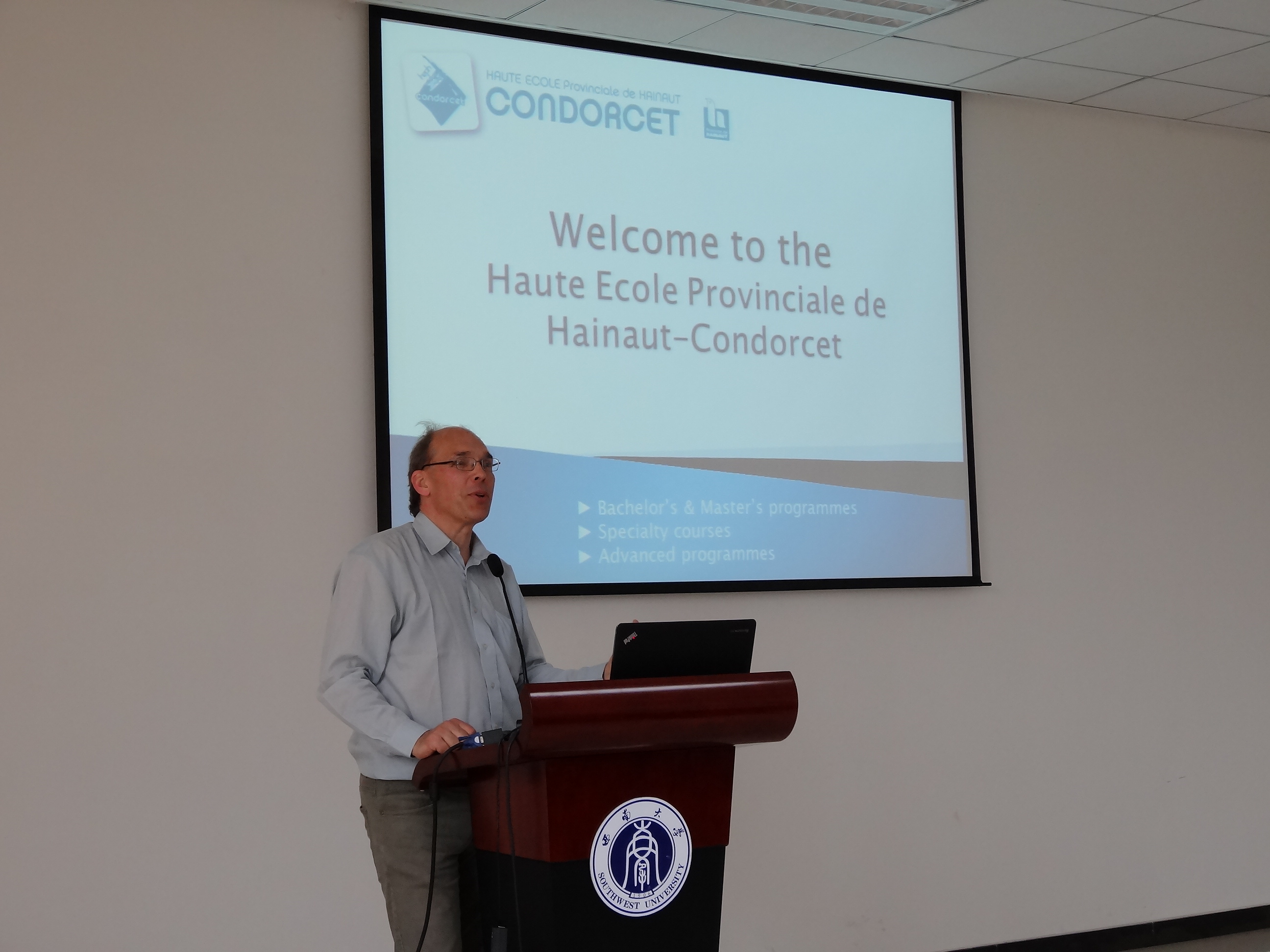 刘猛书记代表公司致欢迎辞。他简要介绍了重庆的概况以及bevictor1946韦德官网的办学情况,向比利时来宾表达了祝福与期待,希望两校今后的交流合作更上一层楼。比利时孔多赛大学学术团代表Serneels先生向bevictor1946韦德官网的师生介绍了该校的办学情况,希望今后双方能进行更多的学术研讨与交流合作。