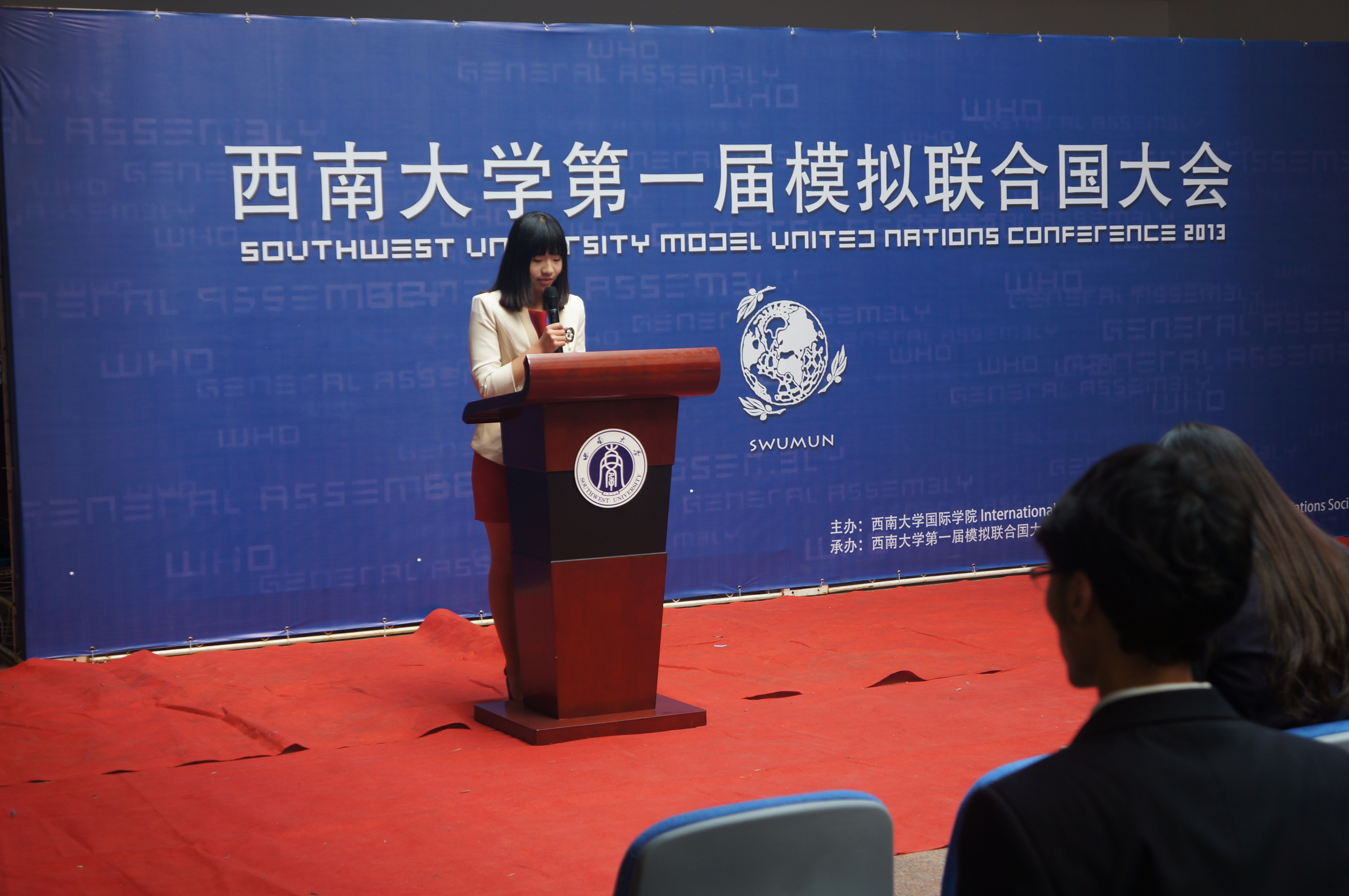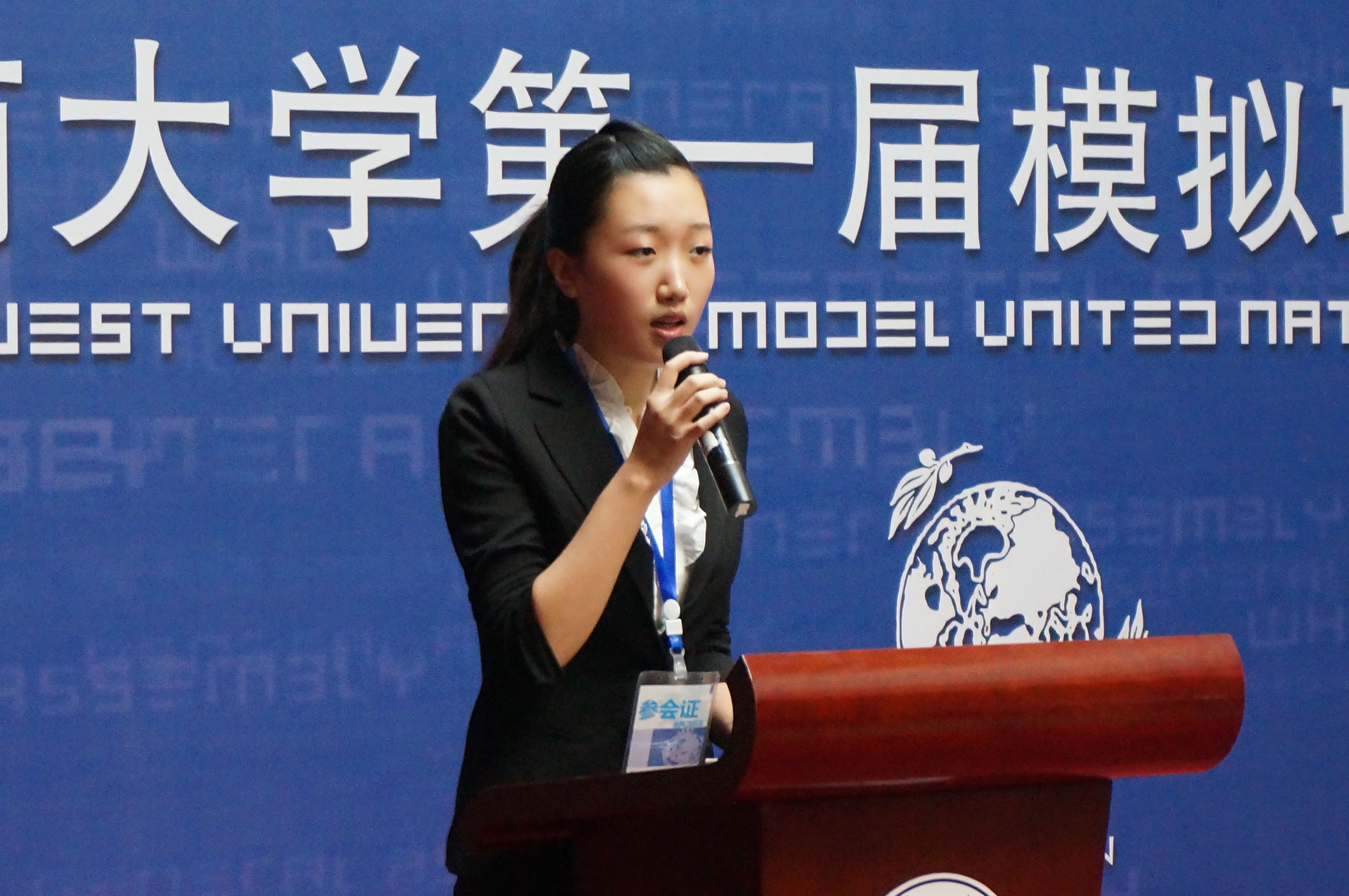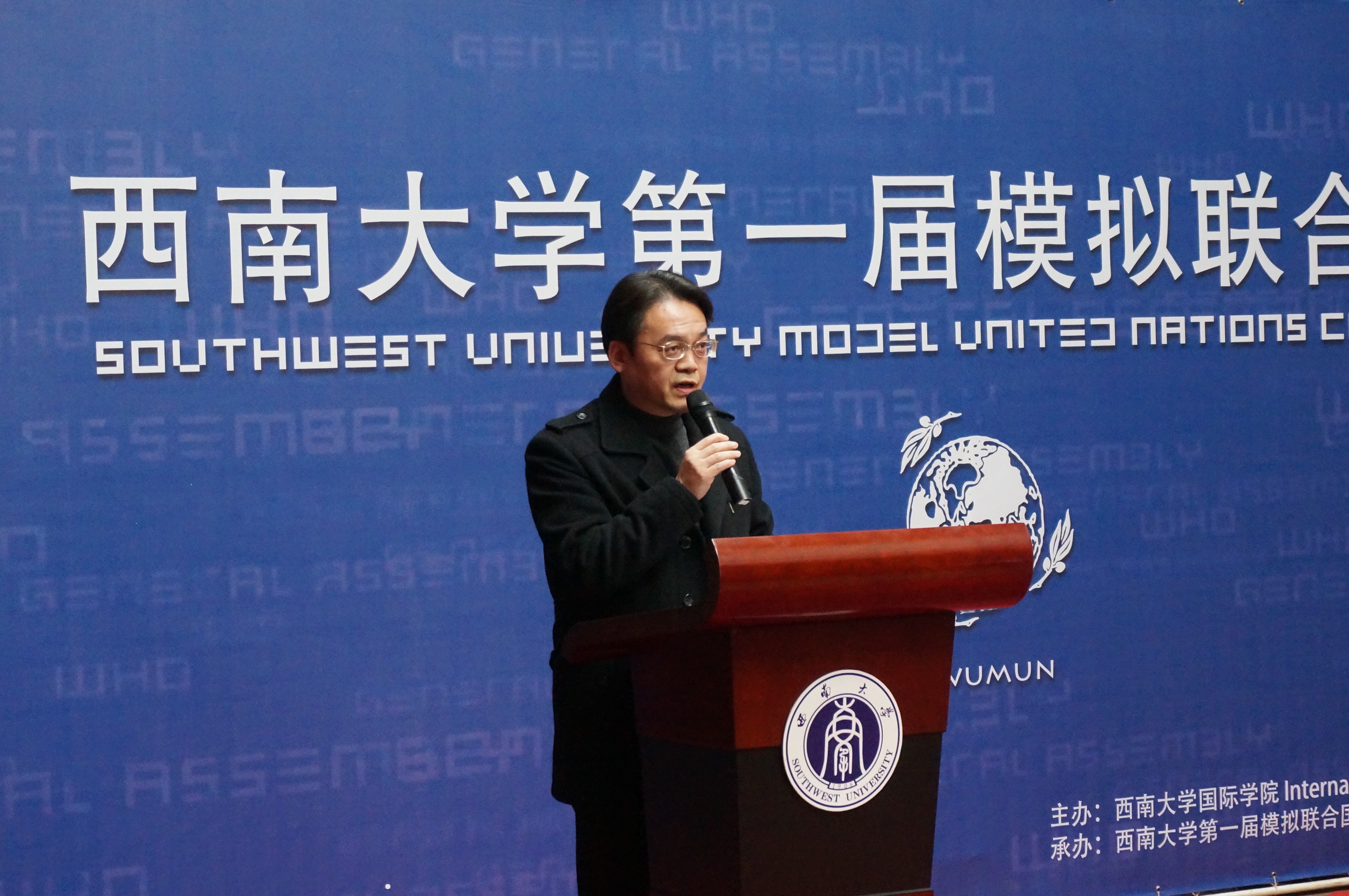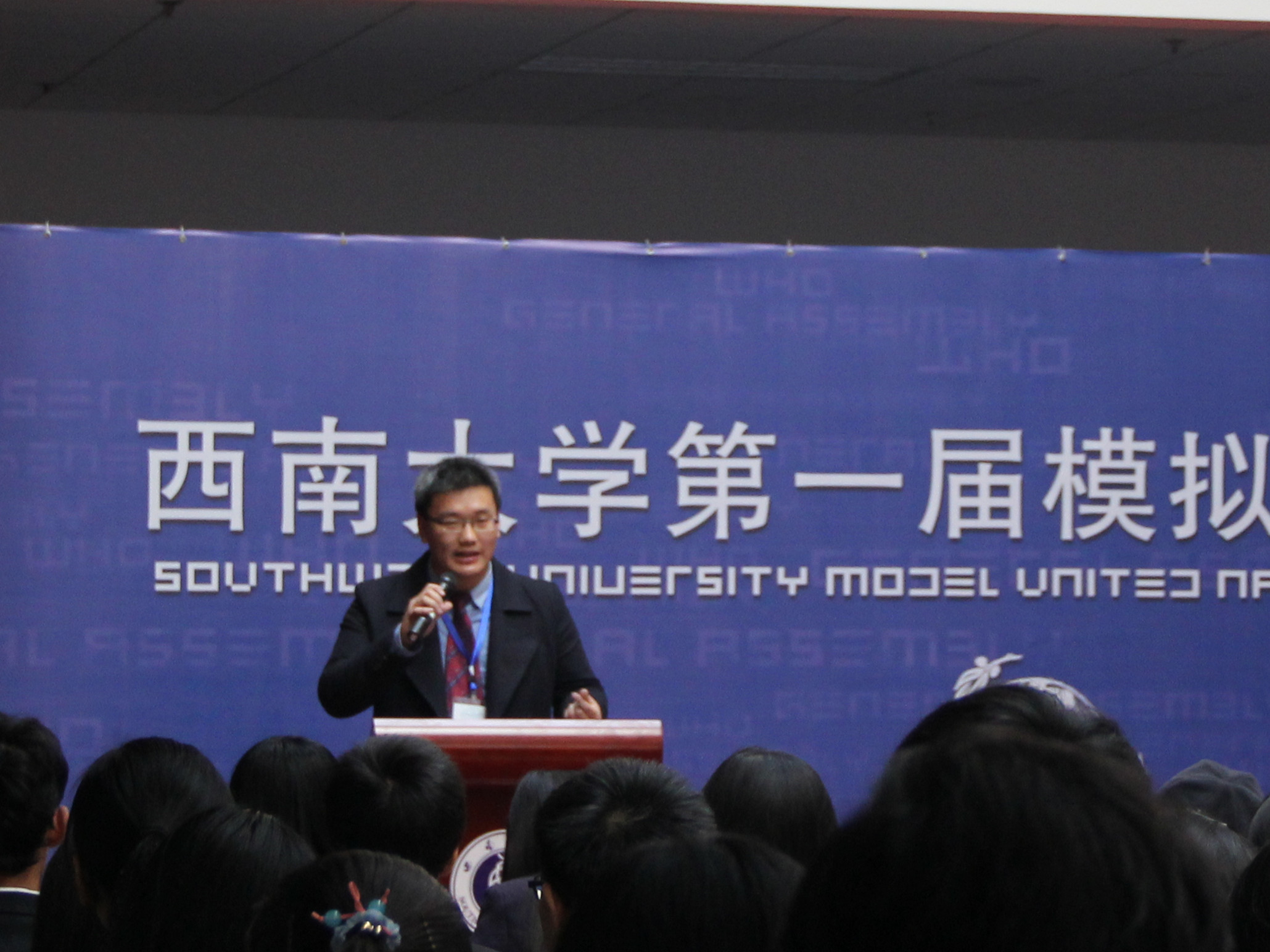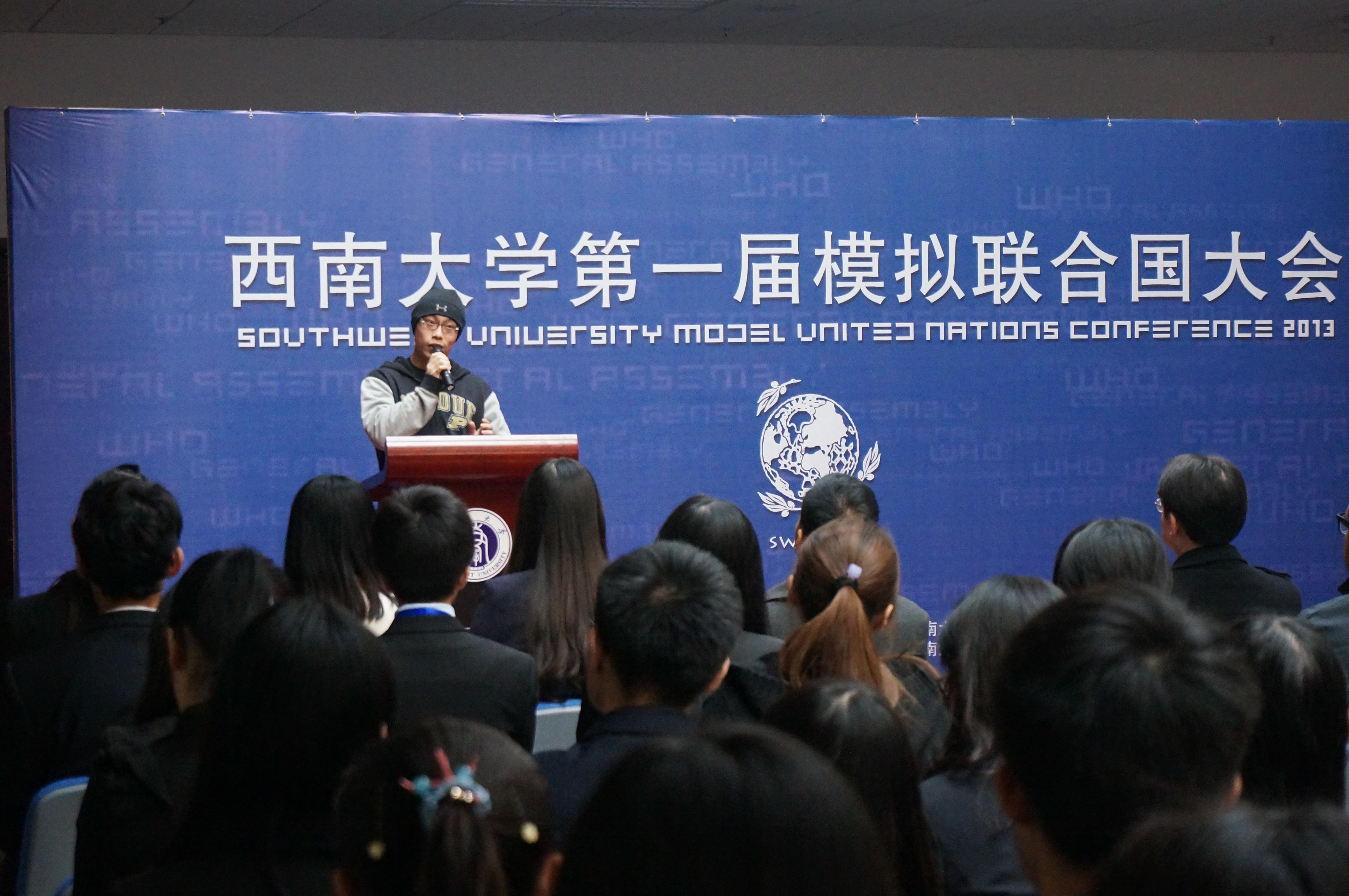 刘经理的讲话从模联对老员工的益处入手,就知识的增加和能力的提高进行了阐述,并介绍了本次大会的议题,他还对参会同学提出了殷切的希望。希望他们在两天的会议中“积极思考,畅所欲言,沟通合作,激扬风采,为世界的和平与发展贡献一份心力。用模拟的会议谱写真实蓝图。”紧接着,bevictor1946韦德官网第一届模拟联合国大会秘书长袁晔发表了讲话,他以全英文的形式向大家介绍了本次模拟联合国大会的主要内容,回忆了自己和模联的故事,讲述了西大模联发展的心路历程和大会筹备过程中的切身感受。最后,他对众多付出辛勤与汗水的幕后工作人员表示了衷心的感谢。