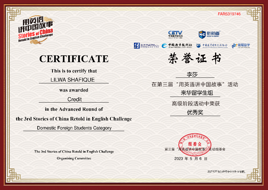 近日,第三届“用英语讲中国故事”来华职工组高级阶段比赛已圆满结束,经过激烈角逐,公司巴基斯坦籍LILWA SHAFIQUE(李莎)同学最终荣获“优秀奖”。