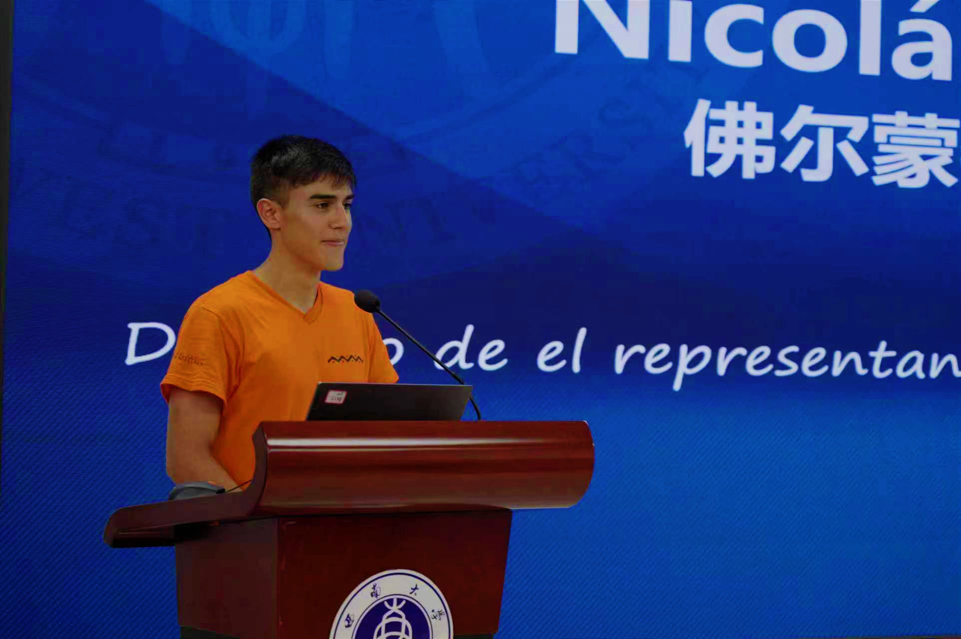 集团哥伦比亚籍中国政府奖学金获得者、教育学部硕士研究生Andres发言,介绍自己来华学习的经历和对学部、公司以及重庆的印象,鼓励大家争取机会,早日实现“留学西大”梦。