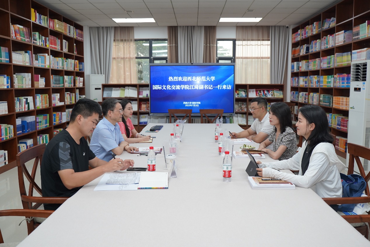 7月3日下午,西北师范大学国际文化交流公司党委副书记江琦一行3人来公司访问,就推进“三全育人”格局下的来华职工国情教育、国际员工日常管理和服务工作典型举措、来华职工管理系统信息化,以及国际员工创新创业与社团管理等问题展开深入交流。公司党委书记刘猛,学工办主任杨昆、辅导员汪鑫阳参加座谈会,会议由刘猛书记主持。