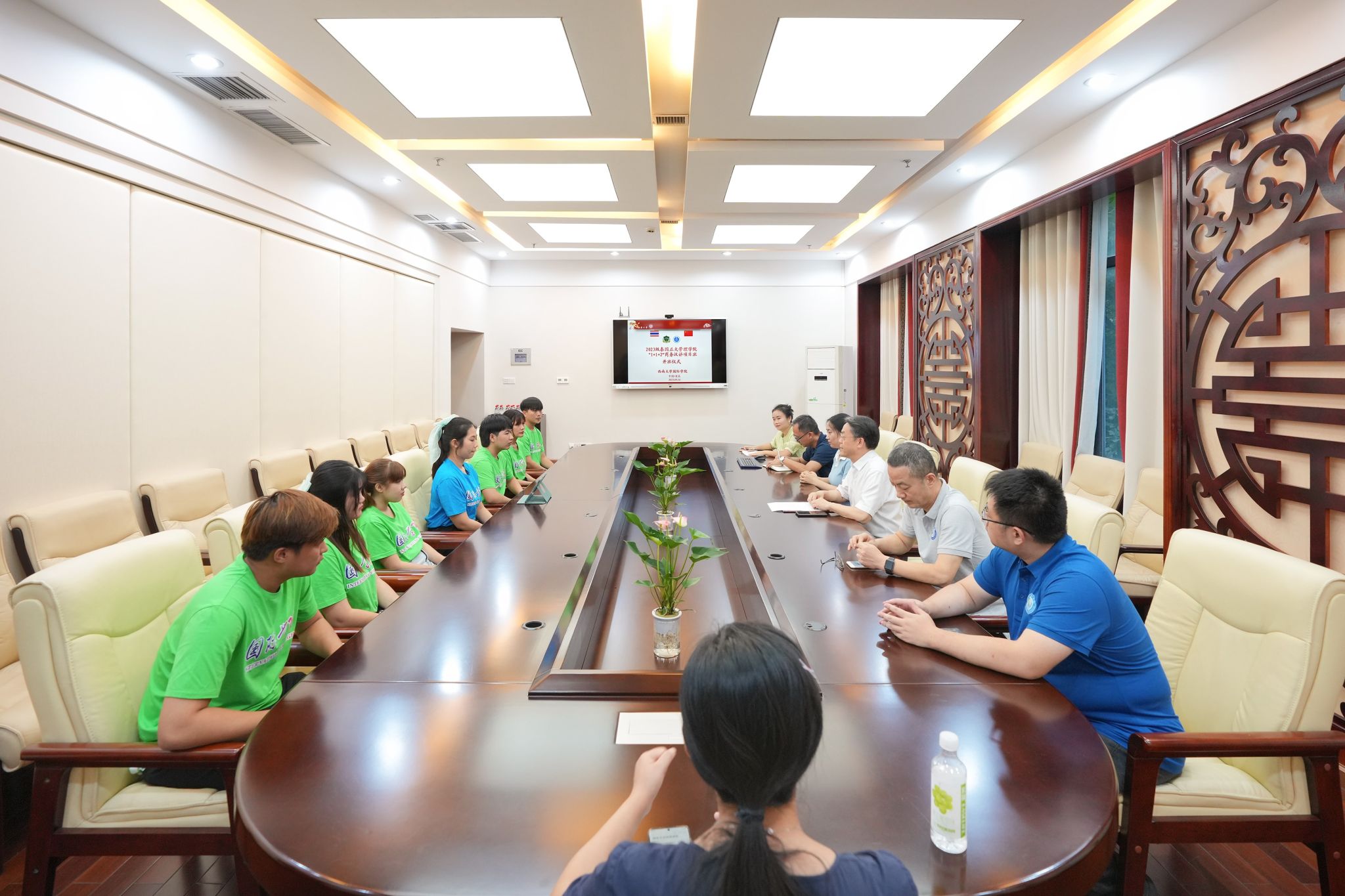 9月14日下午,bevictor1946韦德官网在紫云楼签约室通过“线上+线下”方式隆重举行正大管理公司2023级“1+1+2”商务汉语项目班开班仪式,泰国正大管理公司人文公司陈明明经理,苏兆伟老师和周小月老师,公司党委书记刘猛,副经理李航,项目班主任李丹、任课教师代表刘妍芹和冯换叶、招生办黄无为主任和项目负责人王鹊,以及项目班全体新生参加仪式。