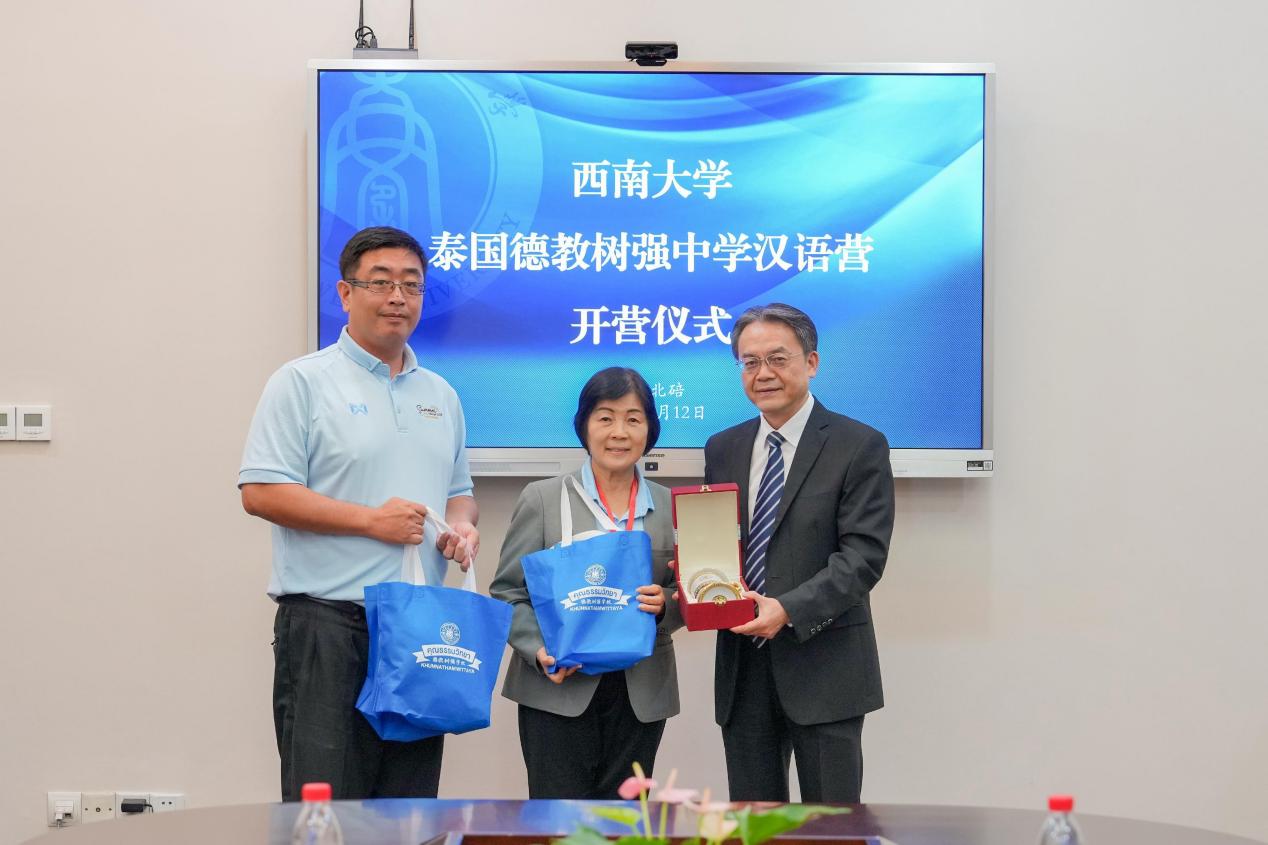 最后,双方代表互赠纪念品,中泰师生在紫云楼大厅前合影留念。