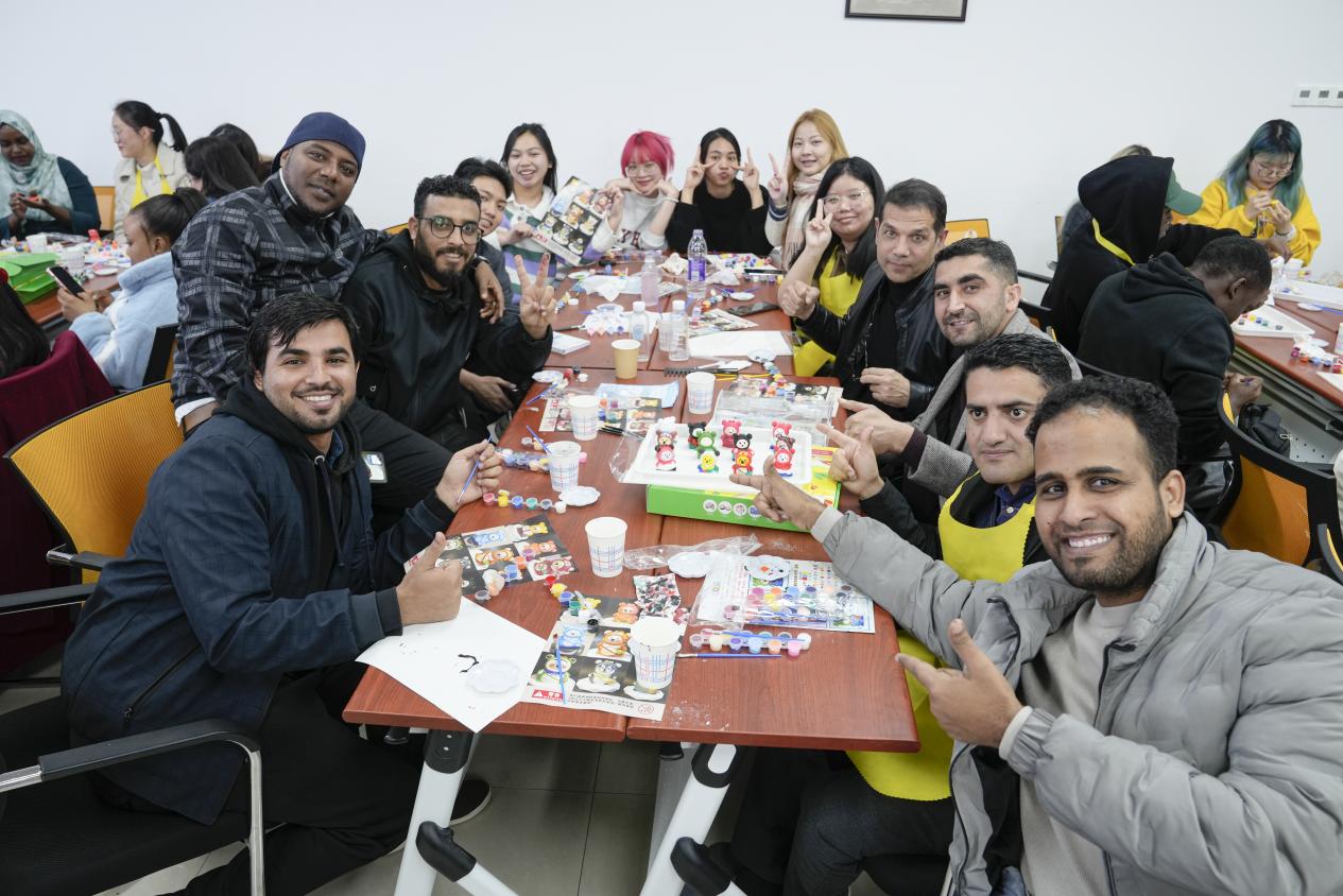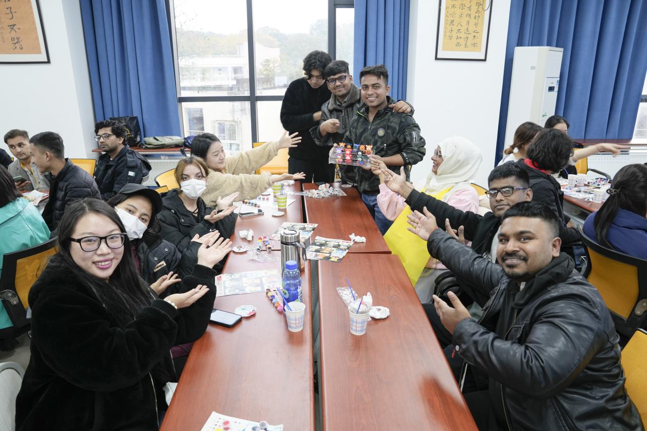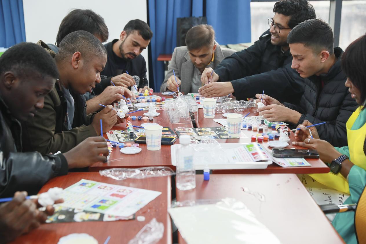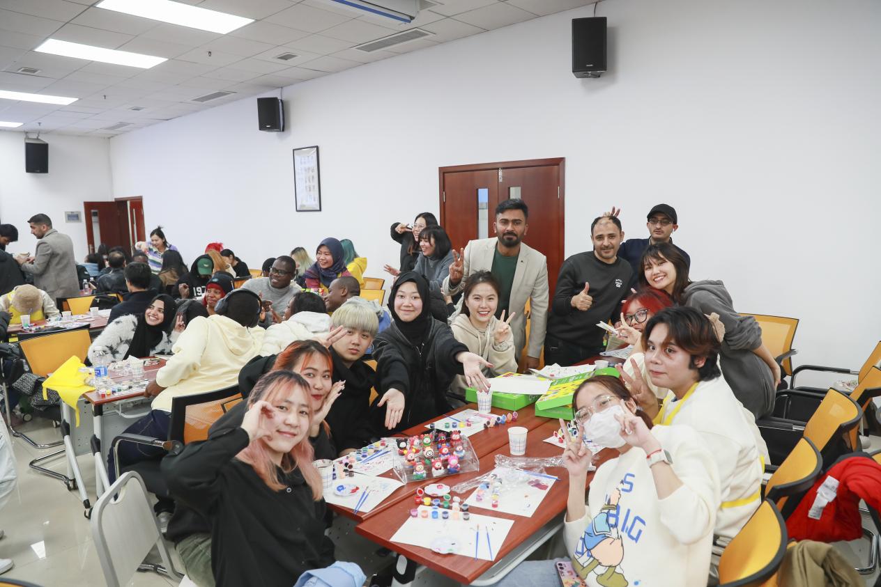 “艺”起涂鸦,心灵减压。每位同学参考本国国旗或民族其他标志,通过给小熊上色的方式,用色彩表达自己的民族身份认同及对家乡的思念。制作专属小熊的过程中,大家以配色、独特图案为线索,互相猜测对方的国家并进一步了解,在艺术海洋里沉浸式进行跨文化交际,放慢脚步、专心创作,在收获快乐的同时凝聚了归属感。