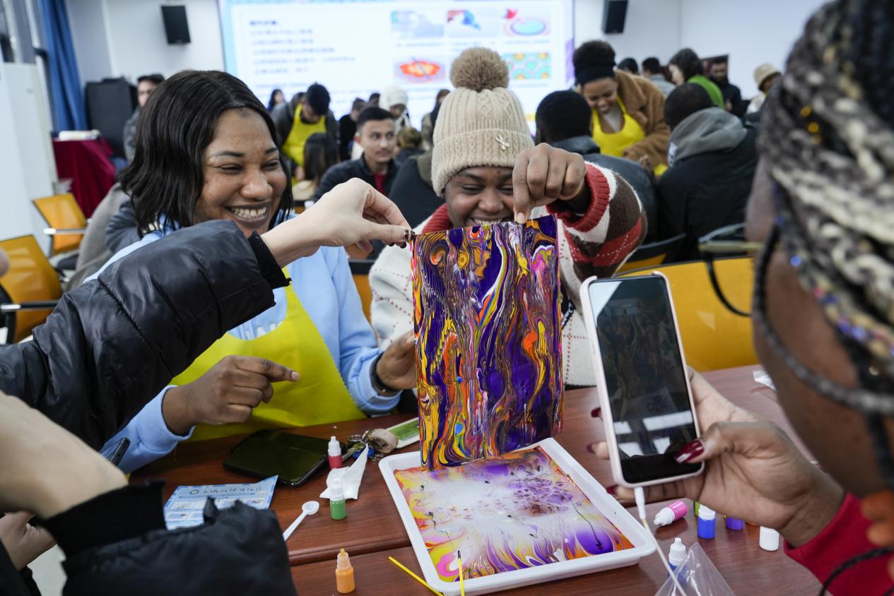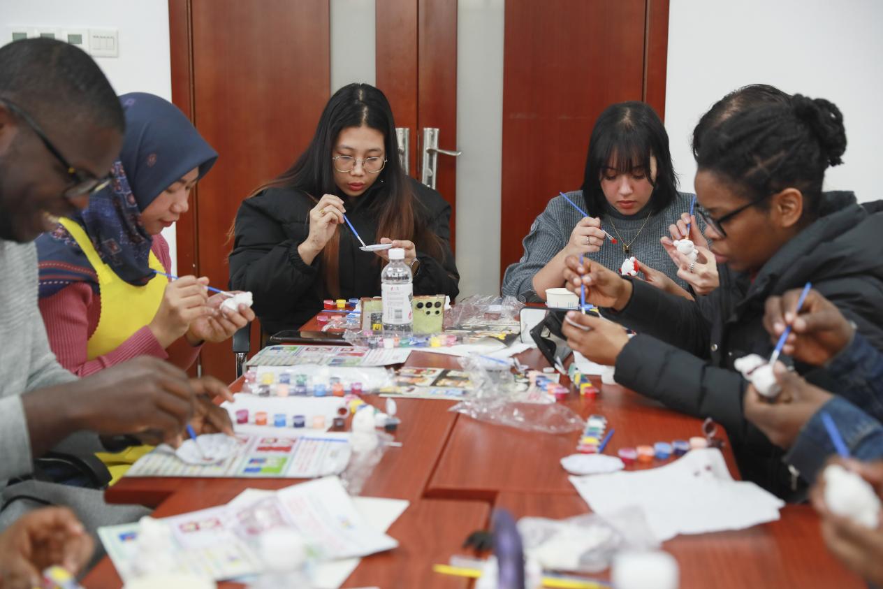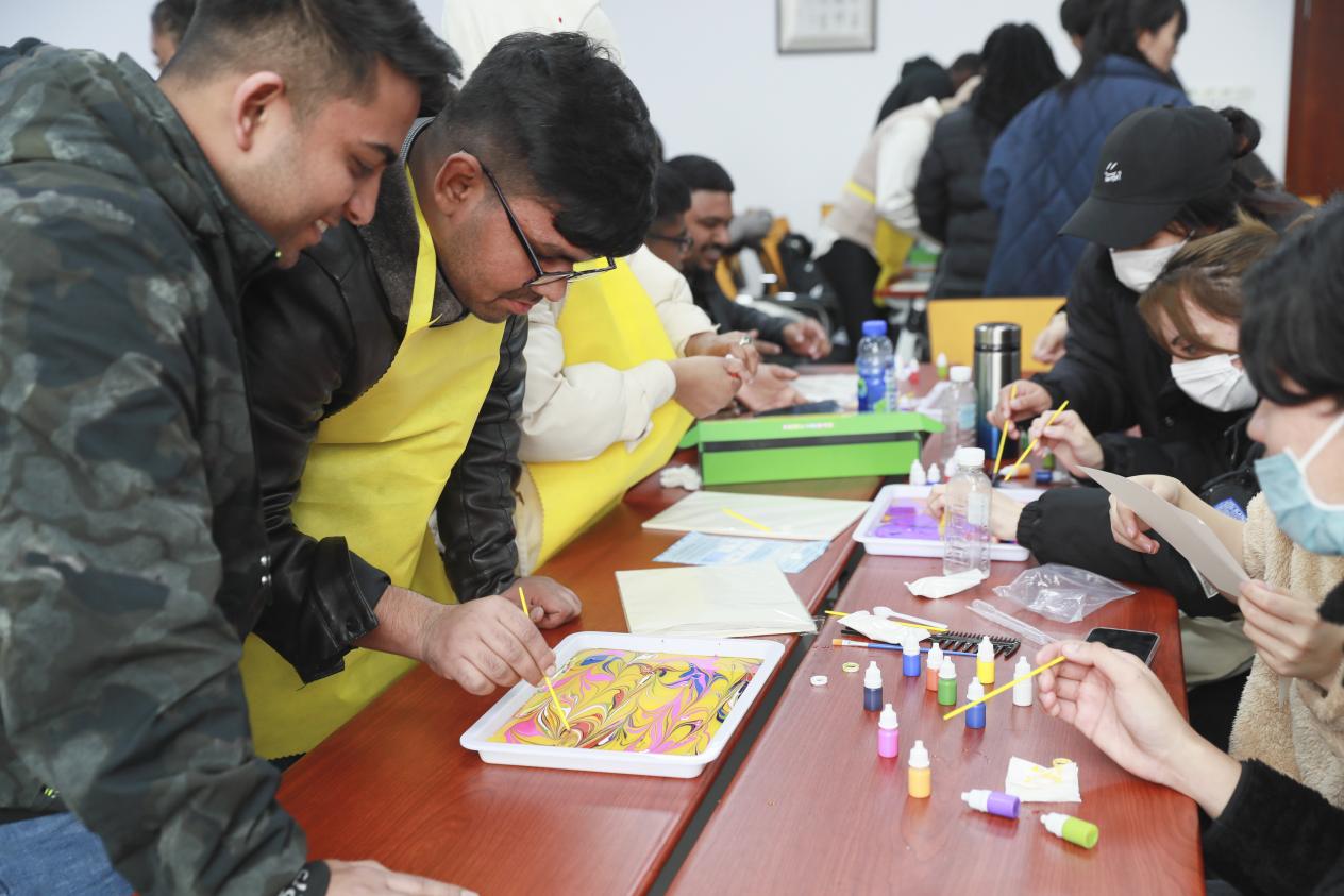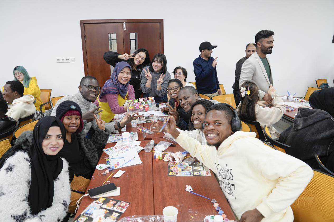 “艺”起涂鸦,心灵减压。每位同学参考本国国旗或民族其他标志,通过给小熊上色的方式,用色彩表达自己的民族身份认同及对家乡的思念。制作专属小熊的过程中,大家以配色、独特图案为线索,互相猜测对方的国家并进一步了解,在艺术海洋里沉浸式进行跨文化交际,放慢脚步、专心创作,在收获快乐的同时凝聚了归属感。