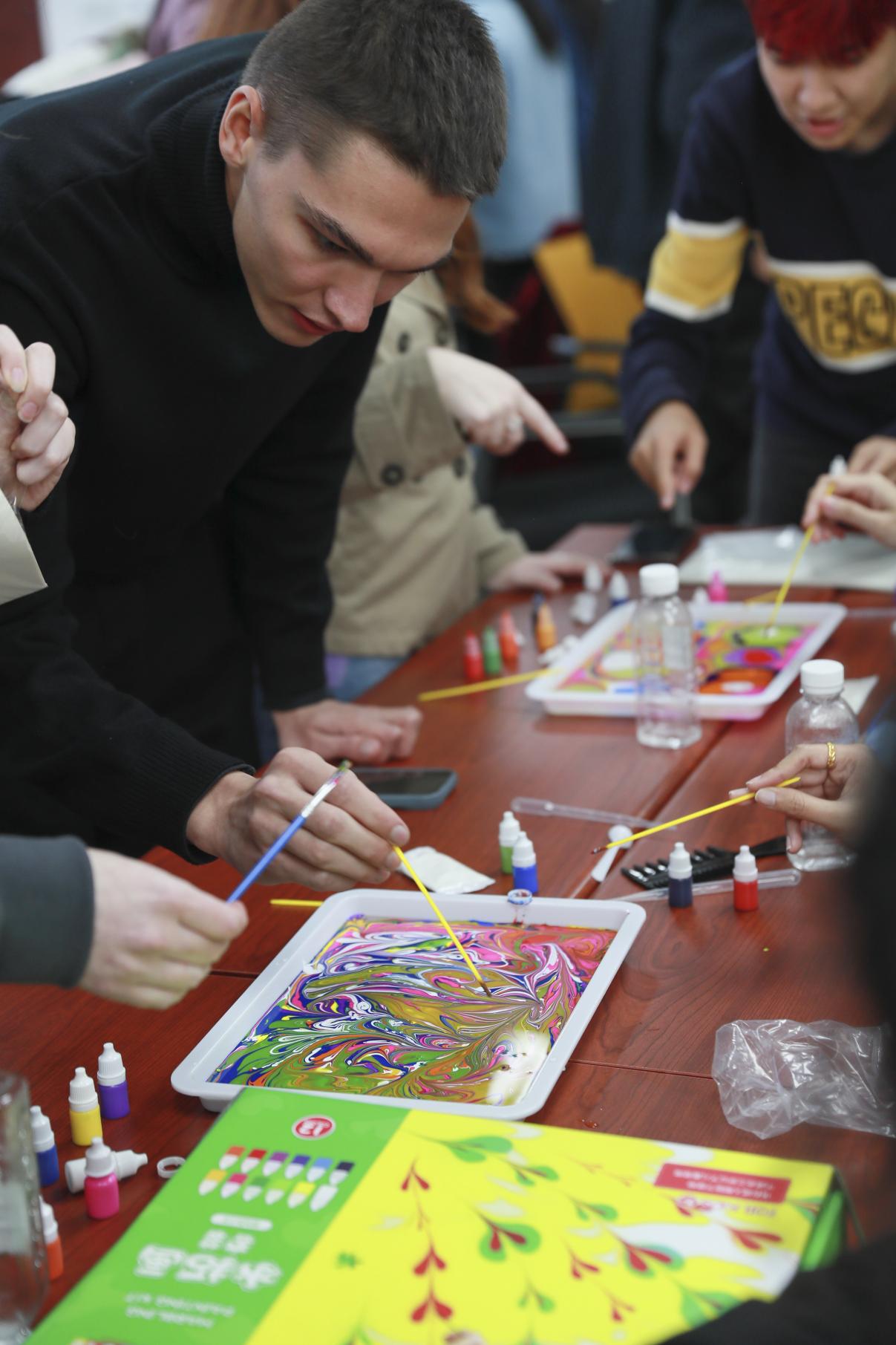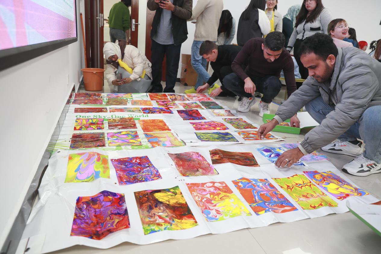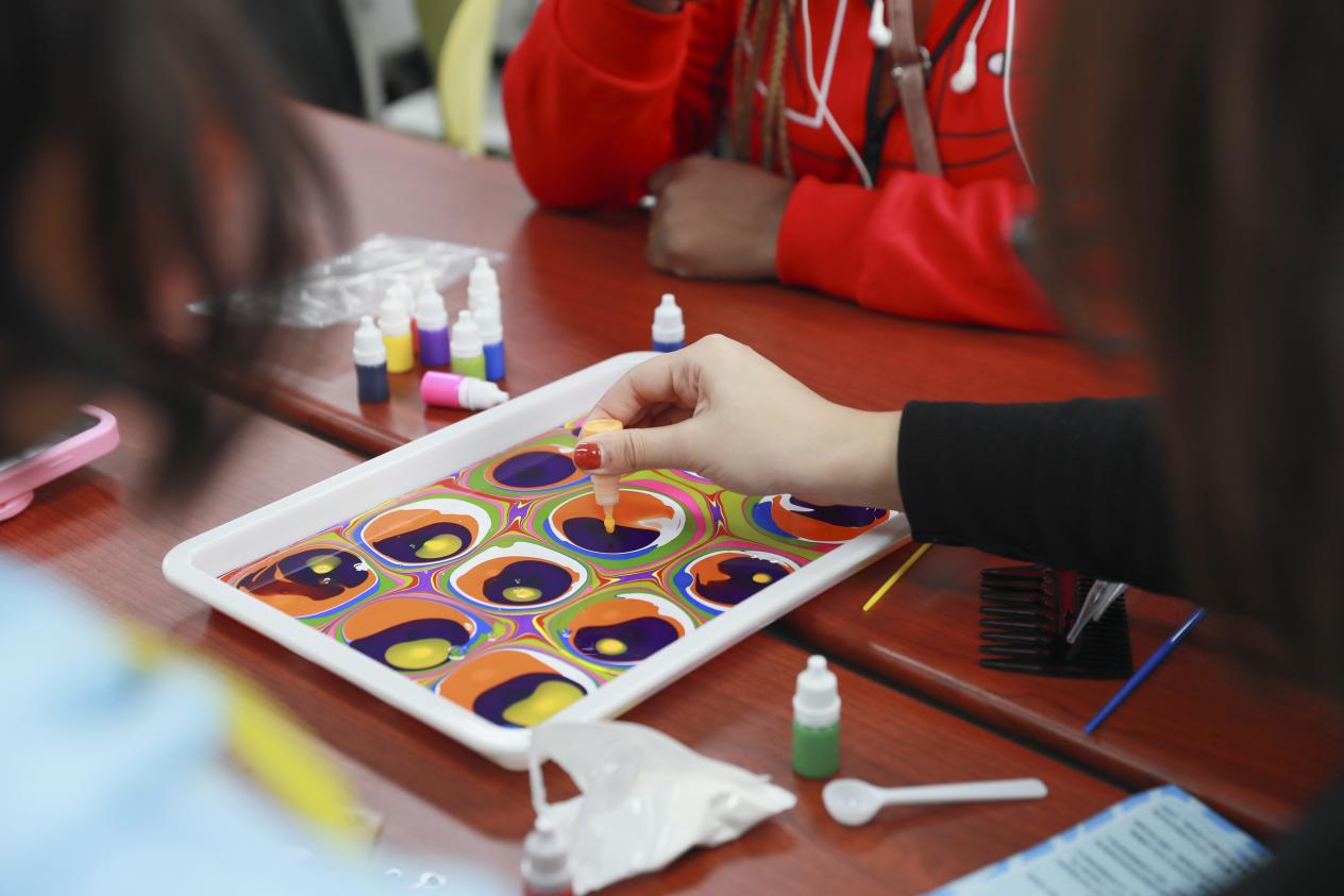 走近绘画心理,探索心灵世界。主持人向大家介绍了世界非遗项目水拓画的历史文化及制作材料,讲解了拓印步骤。话毕手至,大家充分发挥创造力,在画液与颜料的碰撞中完成了一幅幅完美的水拓画,有多层桃心、阳光沙滩、日照金山的清新派,也有用色大胆、线条错杂的抽象派,其中中国汉硕生以五色为底绘出大道、以太阳为路标,祝愿“一带一路”第二个十年越走越远,赢得了一致好评。