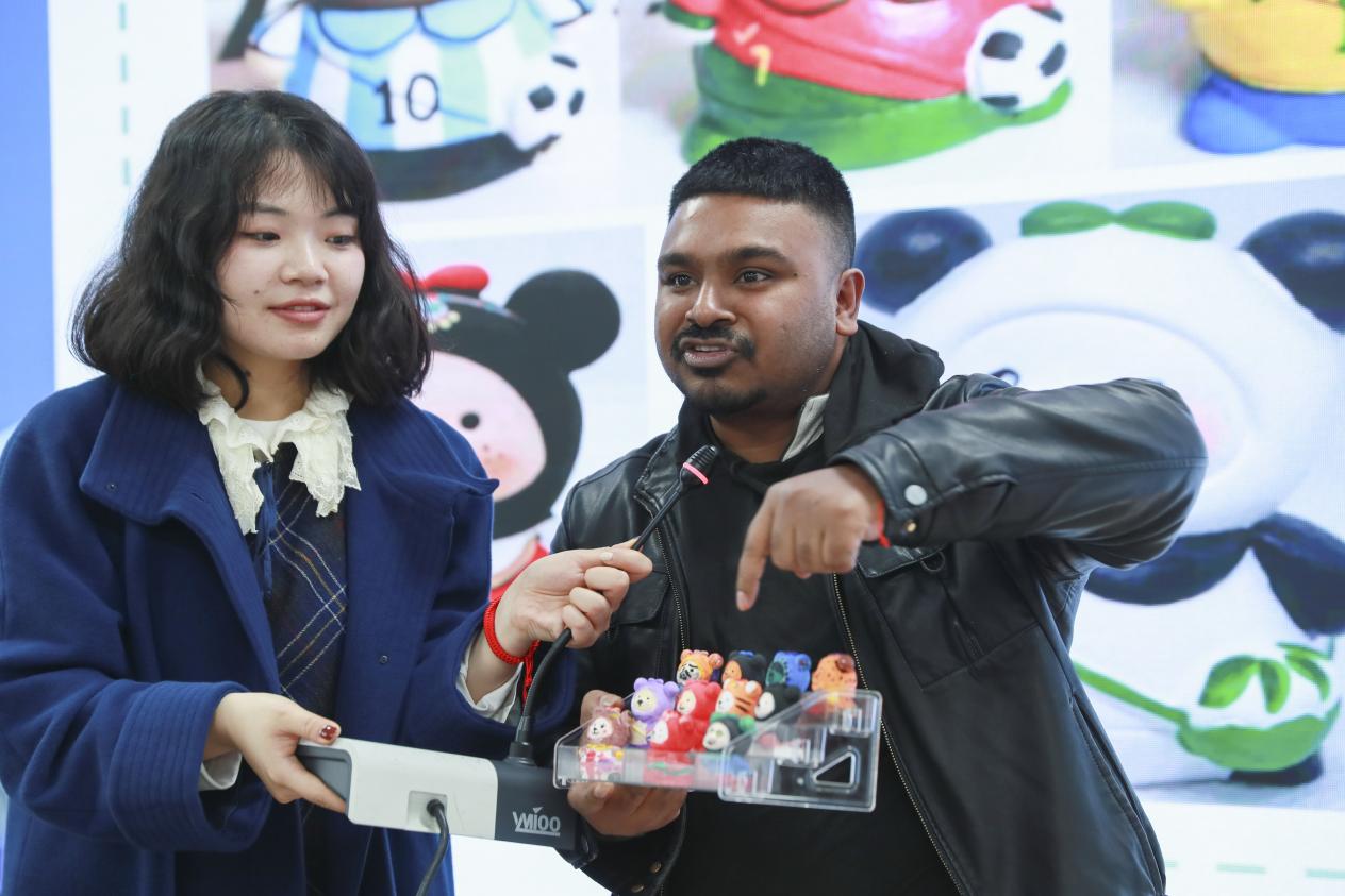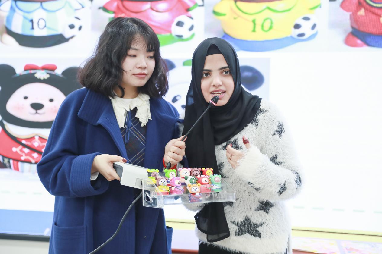 本轮活动巧妙使用同学们前一轮制作的小熊,每一个大组的同学将代表自己的小熊放在代表电影院座位的盒子里,组内讨论选择自己喜欢的位置。分享环节,现场同学通过几轮游戏得到情绪舒缓与解压,纷纷上台讲述今天与各国朋友相知相交的故事。其中一对好朋友分别来自中国和巴基斯坦,她们以“中国国宝”熊猫为原型,在小熊背面用巴基斯坦国语——乌尔都语写上了二人的名字,一旁绽放的友谊之花也是对中巴两国72年铁杆友谊的衷心庆贺。