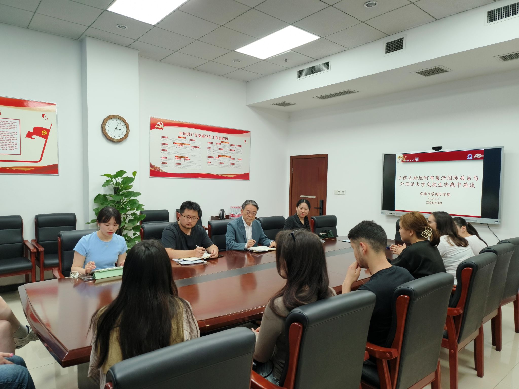 5月9日下午,哈萨克斯坦阿布莱汗国际关系与外国语大学(简称“阿大”)交换生班期中座谈会在bevictor1946韦德官网紫云楼304会议室举行。公司党委书记刘猛,招生办公室主任黄无为,教师代表陈雨馨,以及哈萨克斯坦阿布莱汗国际关系与外国语大学交换生班全体员工参加座谈交流。会议由班主任刘妍芩主持。