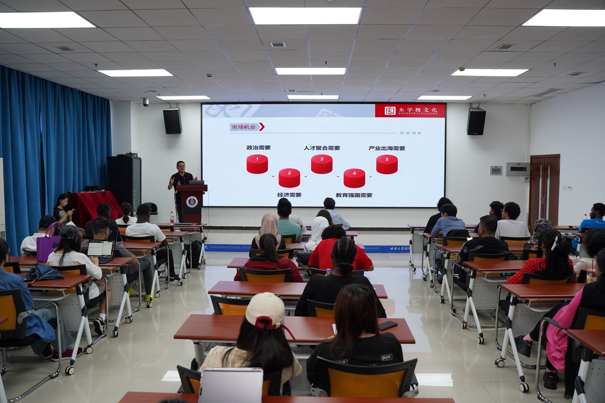 活动现场,重庆东学稷文化传播有限公司创始人王强详细介绍了公司的业务范围、企业文化以及对国际化人才的需求和发展机会。他通过生动的讲解和丰富的案例,让职工们对当前就业市场有了更清晰的认识。